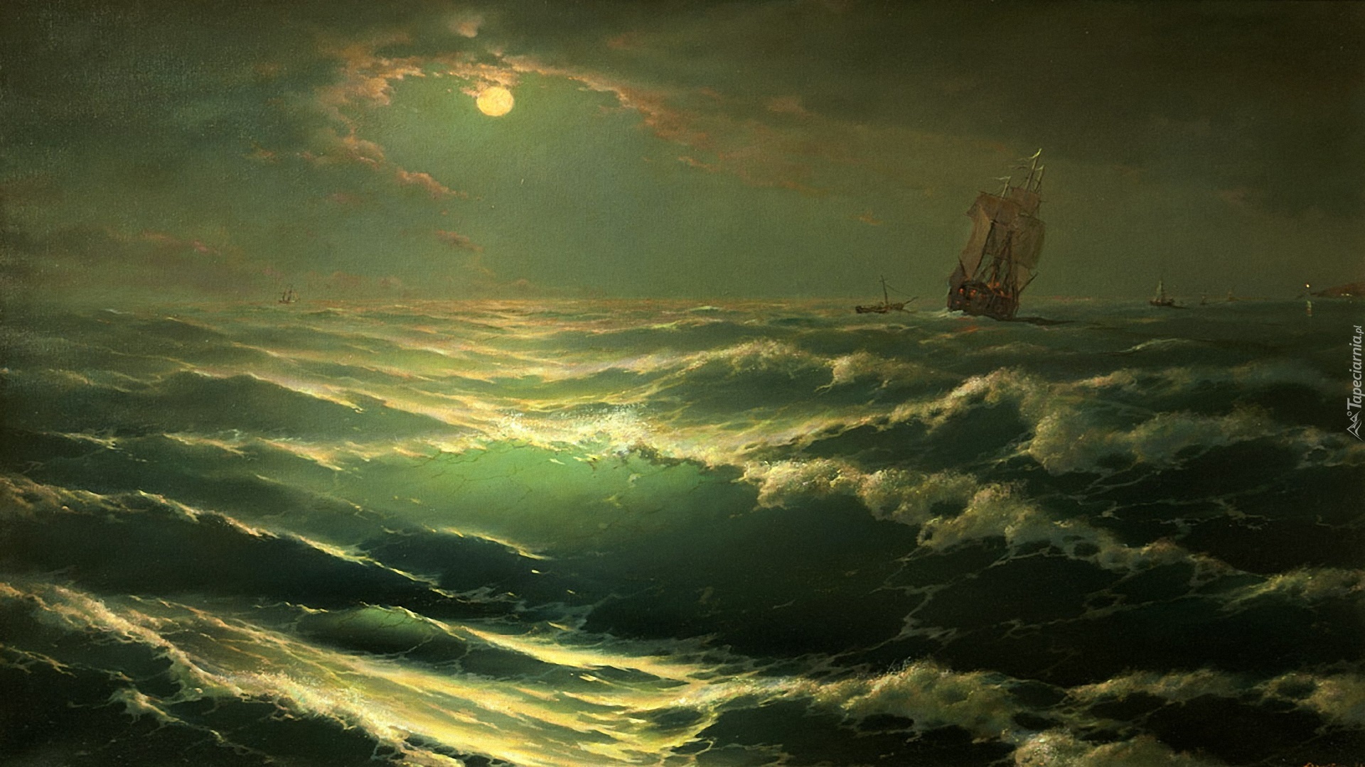 Edytor tapety: George Dimitriev, Malarstwo, Statek, Morze, Noc