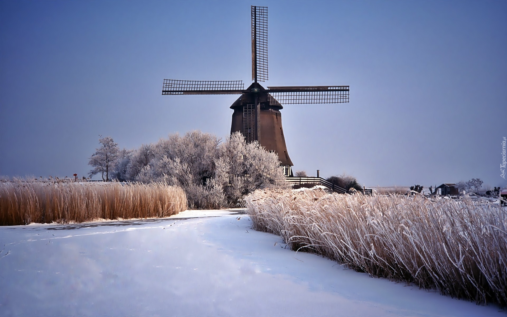 Edytor tapety: Wiatrak, Rzeka, Drzewa, Szuwary, Zima
