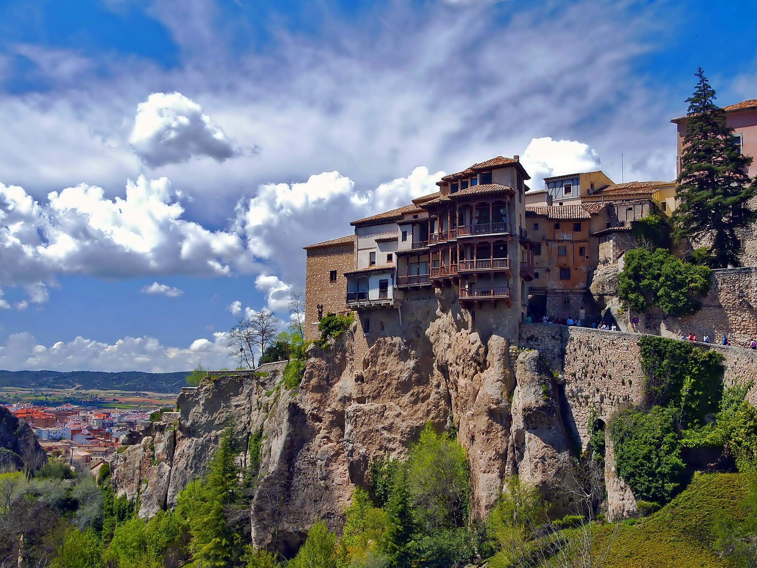 Edytor tapety: Domy, Skały, Roślinność, Obłoki, Cuenca, Hiszpania