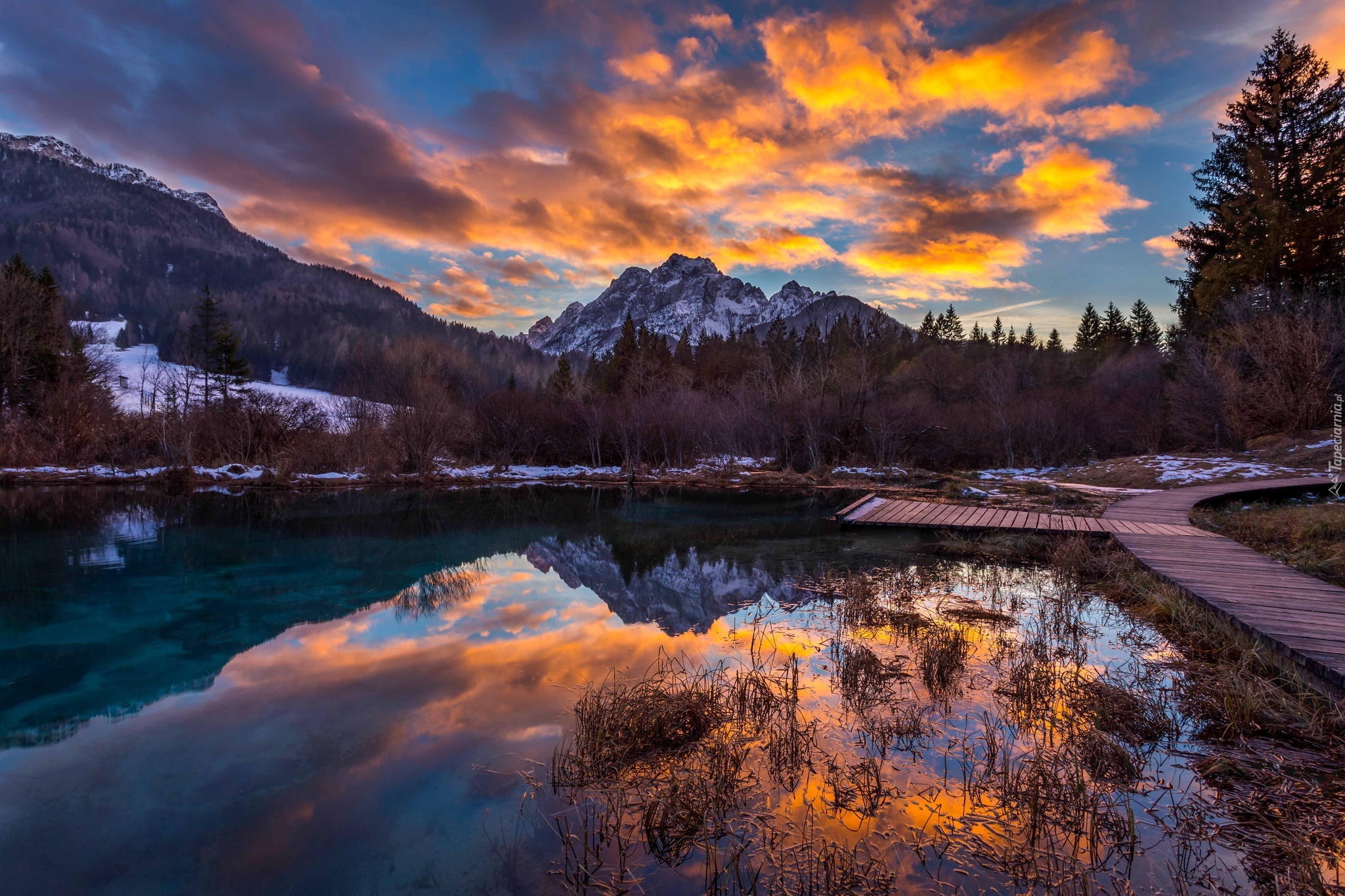 Edytor tapety: Zachód słońca, Góry, Pomost, Jezioro