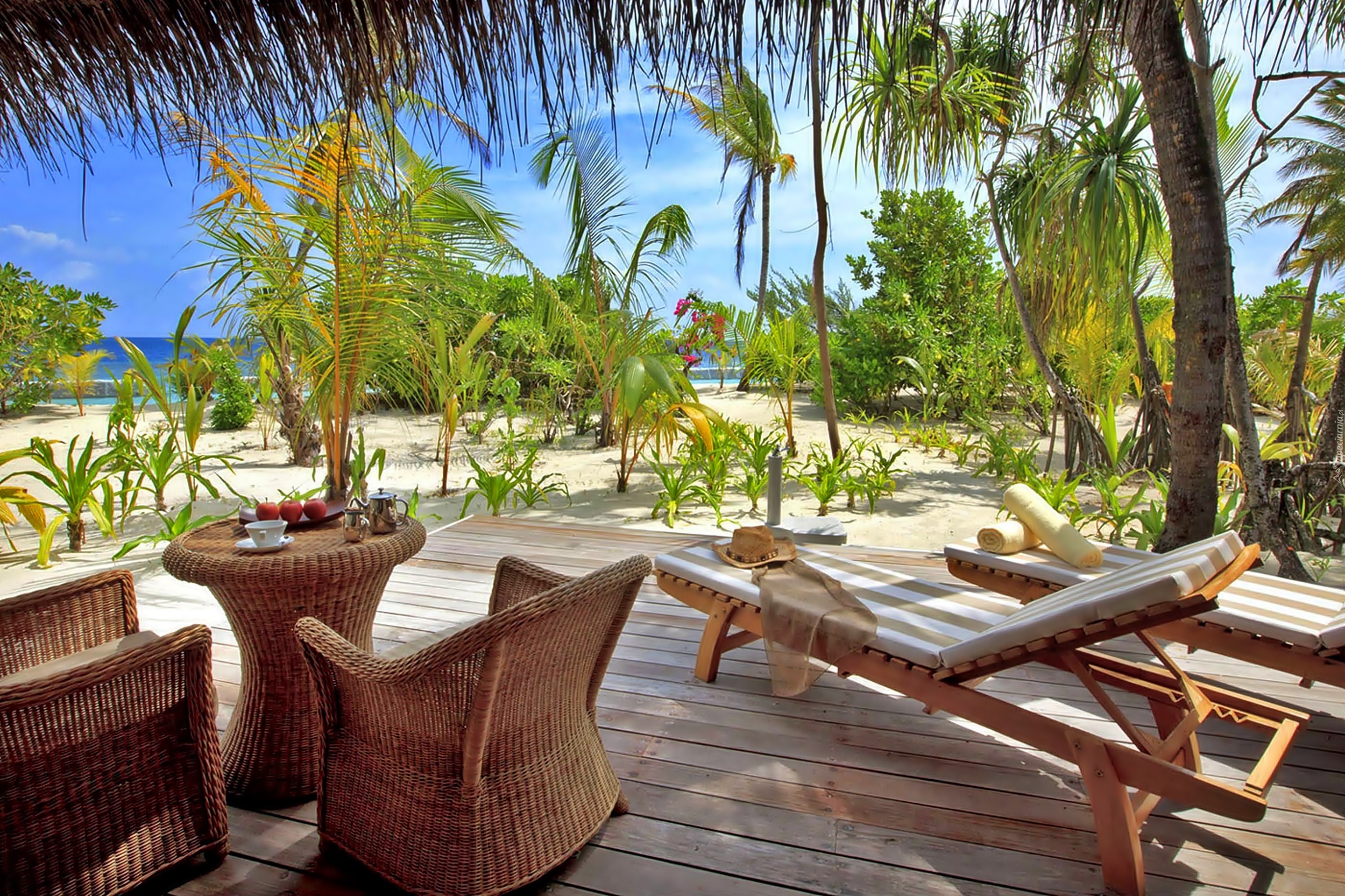 Edytor tapety: Plaża, Palmy, Taras, Komplet, Wypoczynkowy, Przebijające, Swiatło