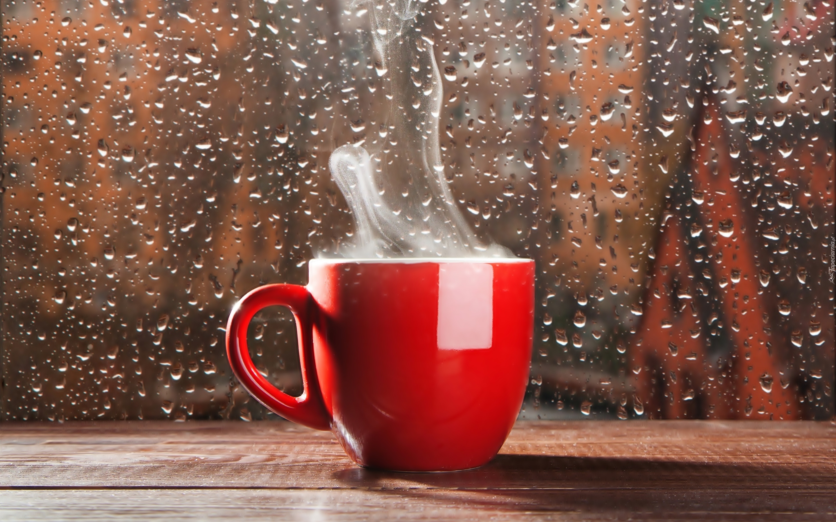 Edytor tapety: Gorąca, Kawa, Czerwona, Filiżanka, Szyba, Krople, Deszczu