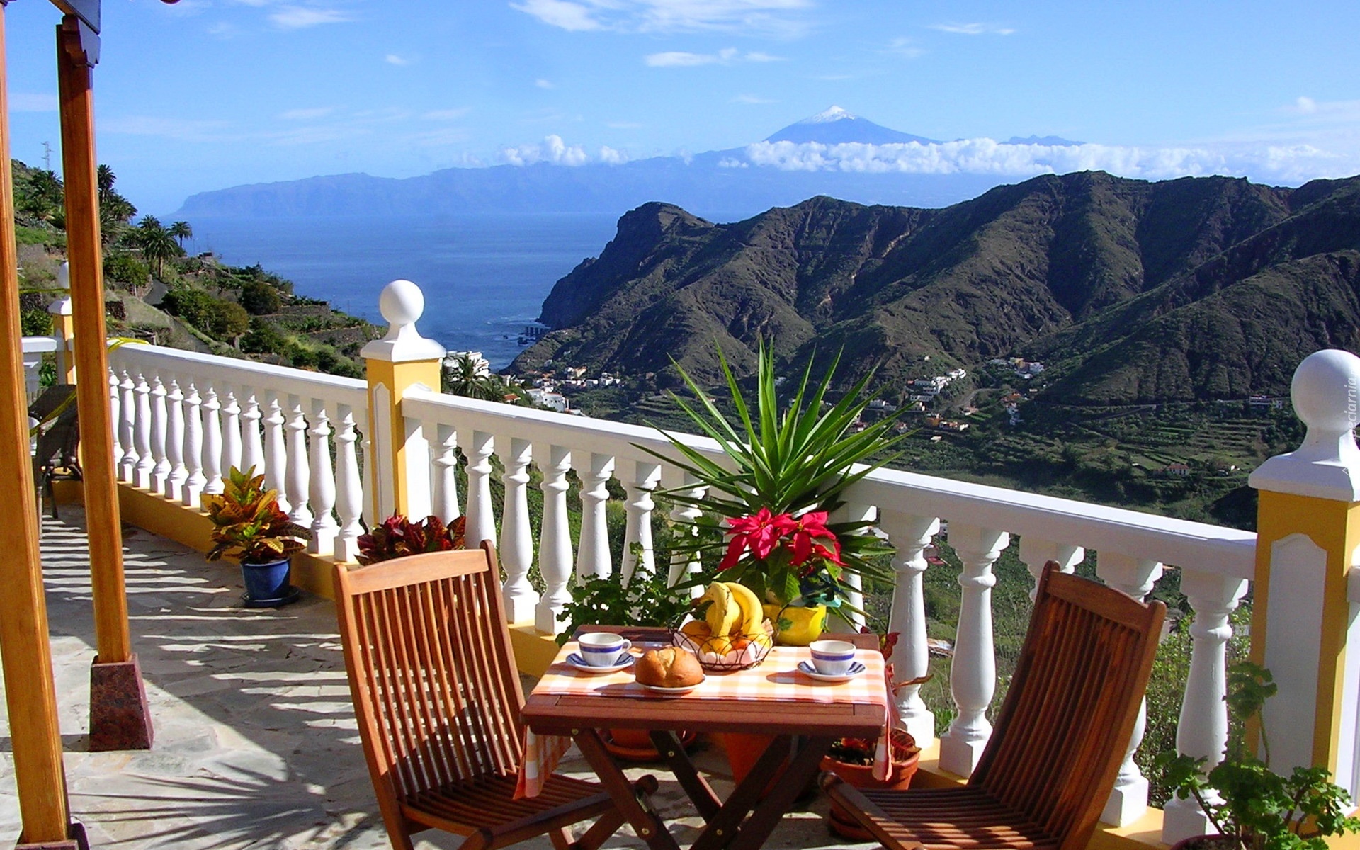 Edytor tapety: Taras, Krzesła, Stolik, Piękny, Widok, Góry