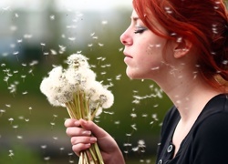 Edytor tapety: Rudowłosa, Kobieta, Bukiet, Kwiatów, Mlecz, Dmuchawce