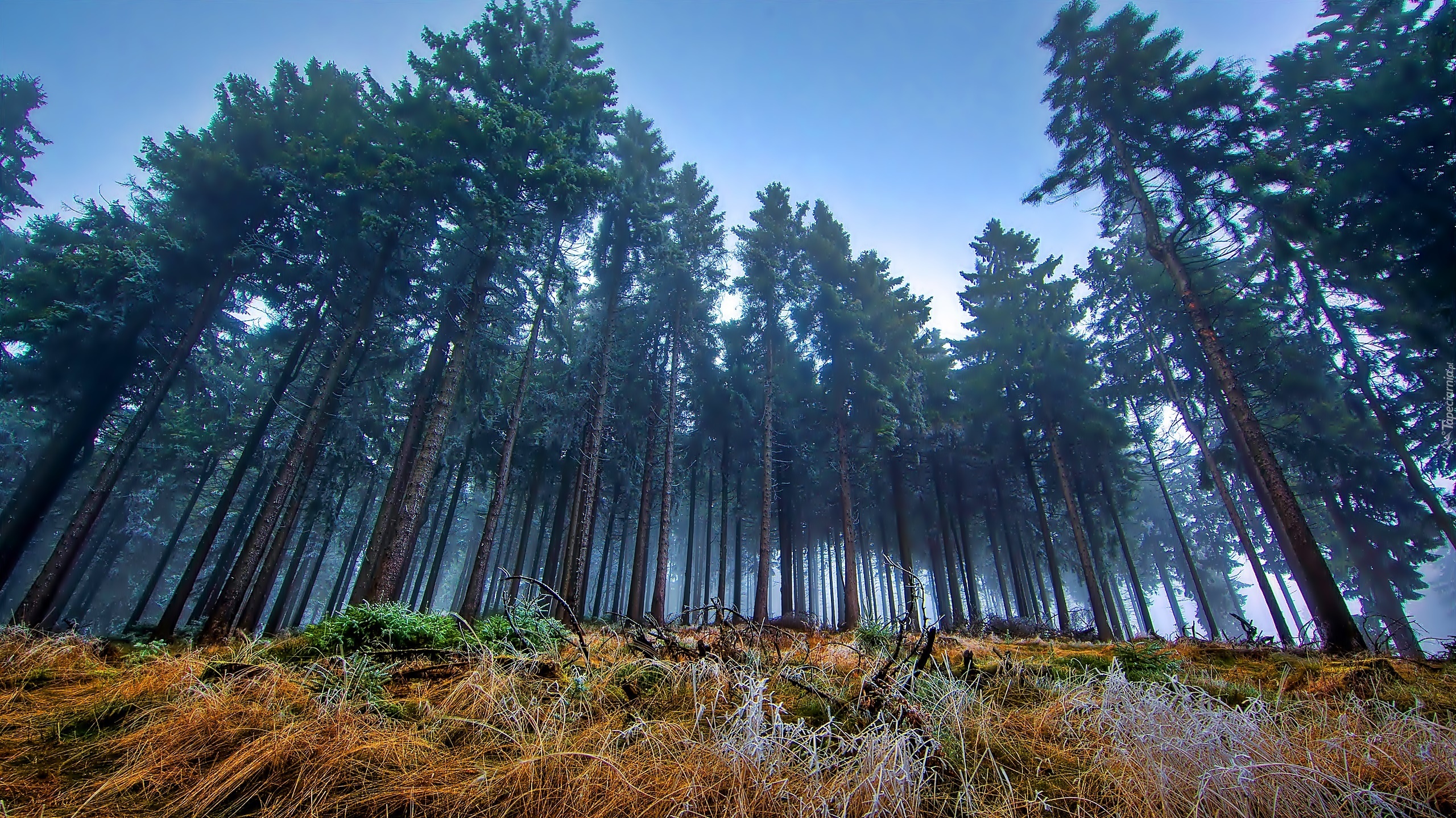 Edytor tapety: Las, Mgła, Polana, Oszronione, Trawy