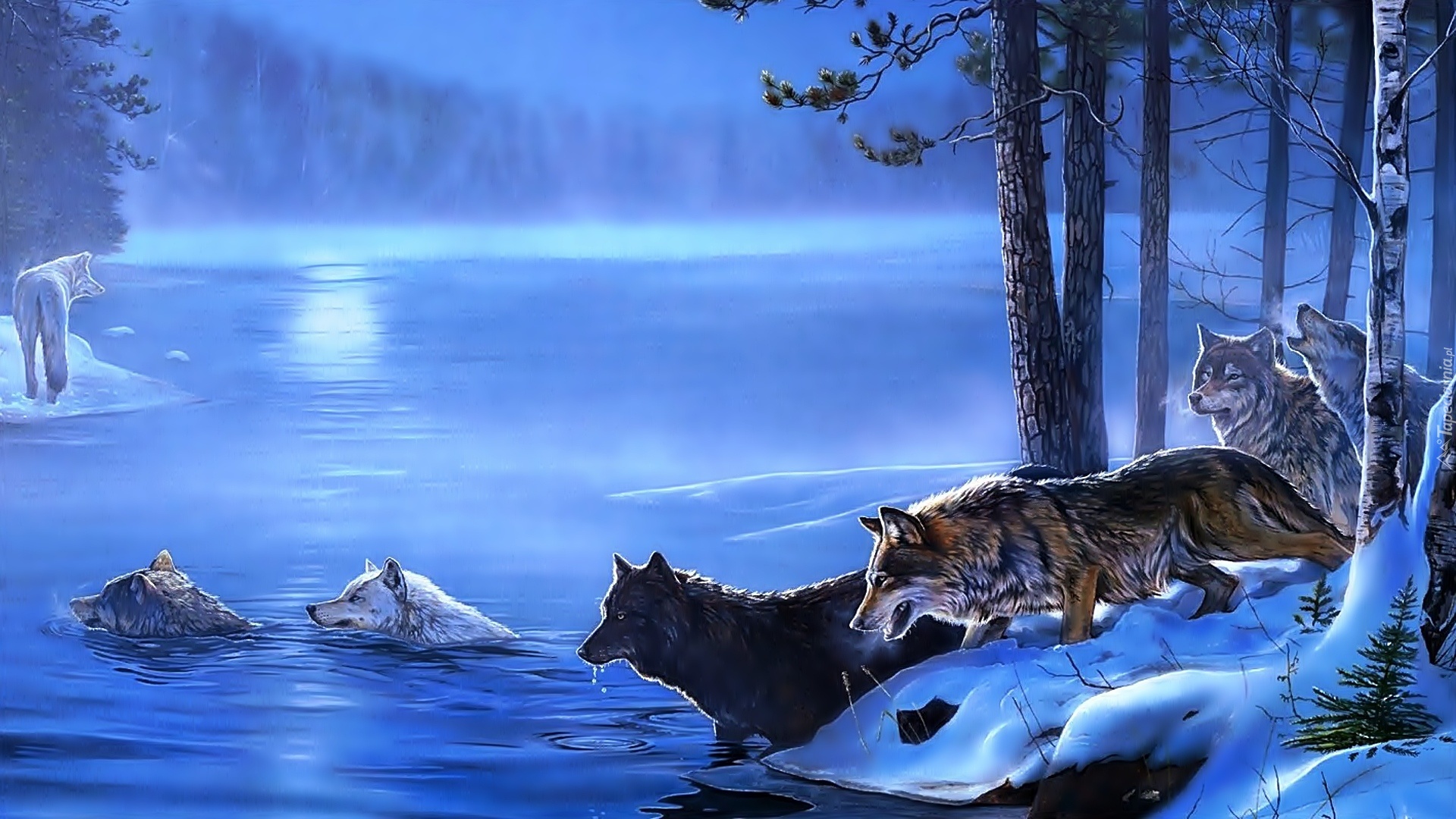 Edytor tapety: Stado, Wilków, Śnieg, Las, Rzeka, Mgła