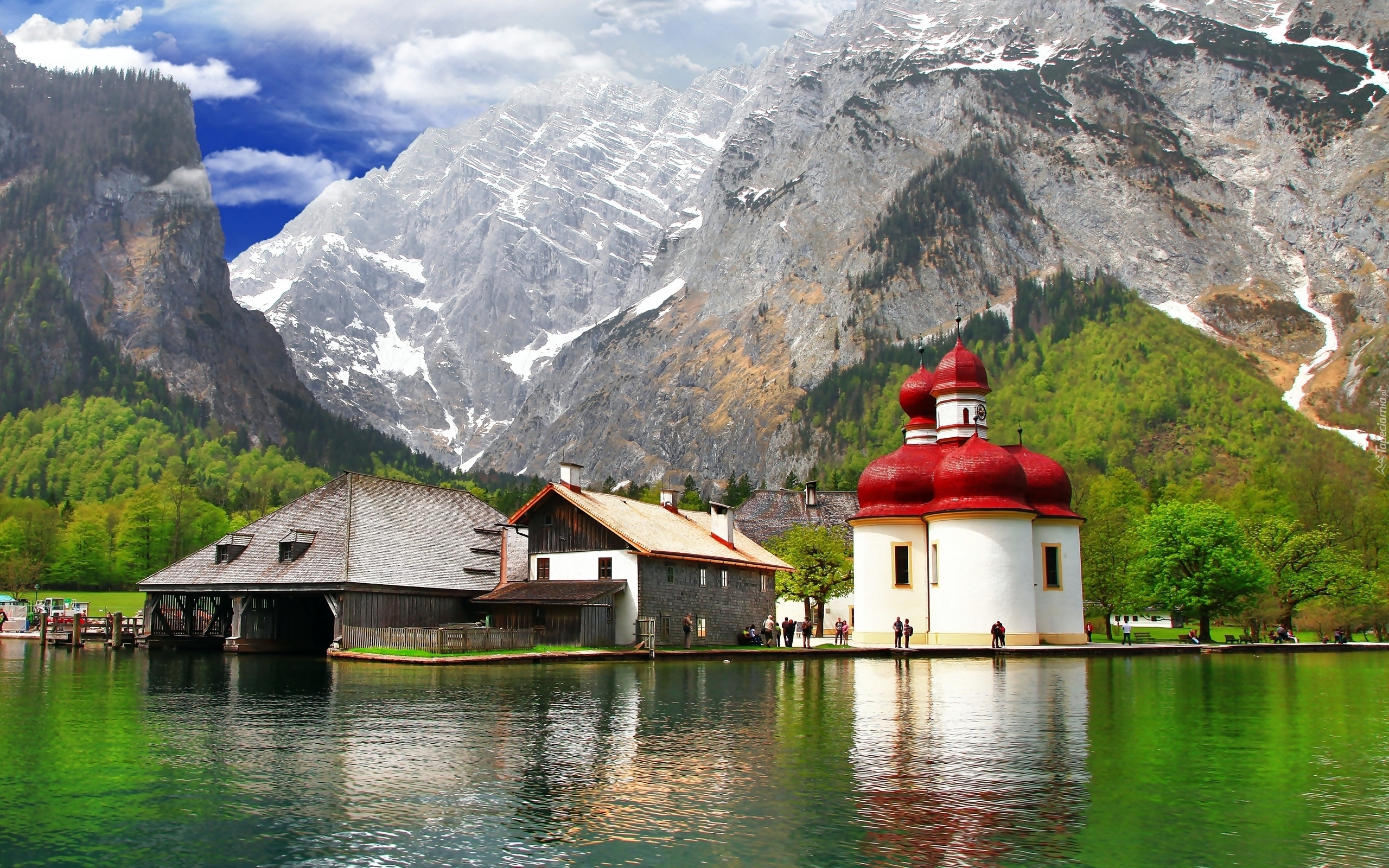Edytor tapety: Góry, Jezioro, Koenigssee, Kościół, Św.Bartłomieja, Bawaria