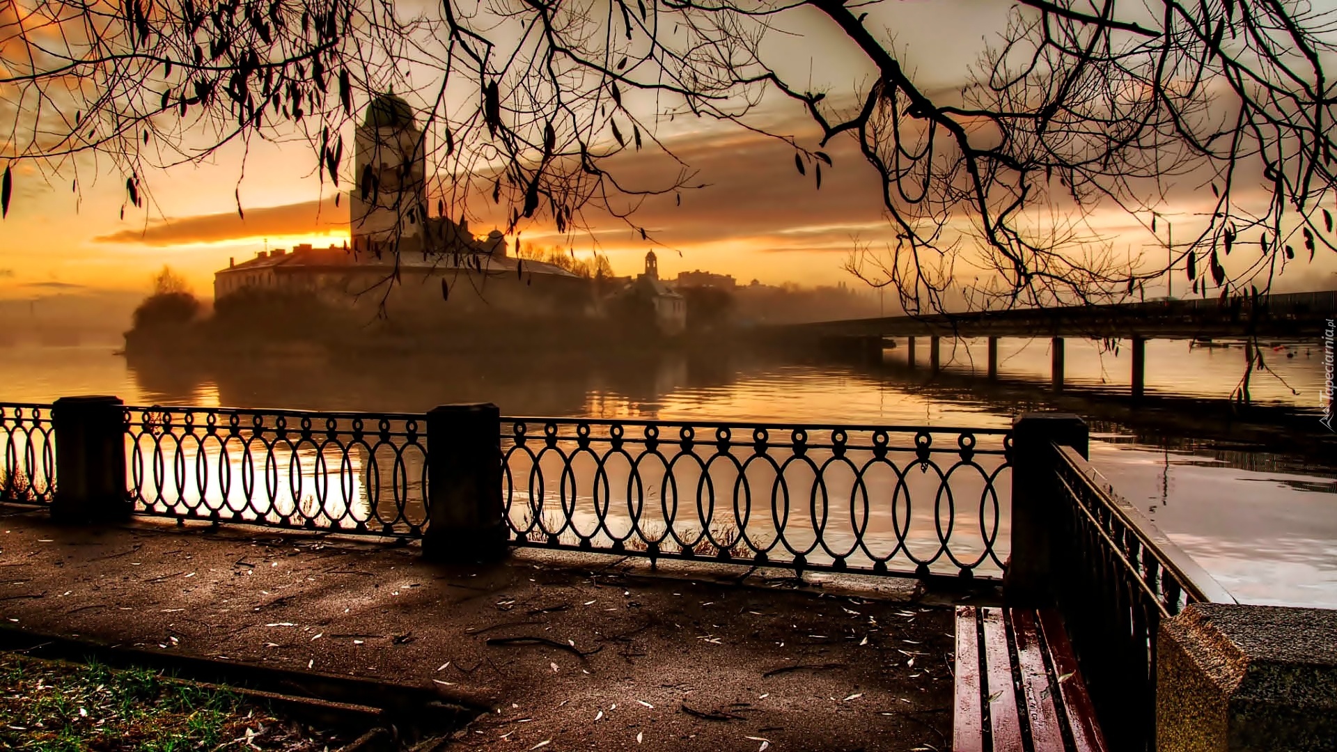Edytor tapety: Rzeka, Most, Mgła, Zachód, Słońca, Zamek, Balustrada