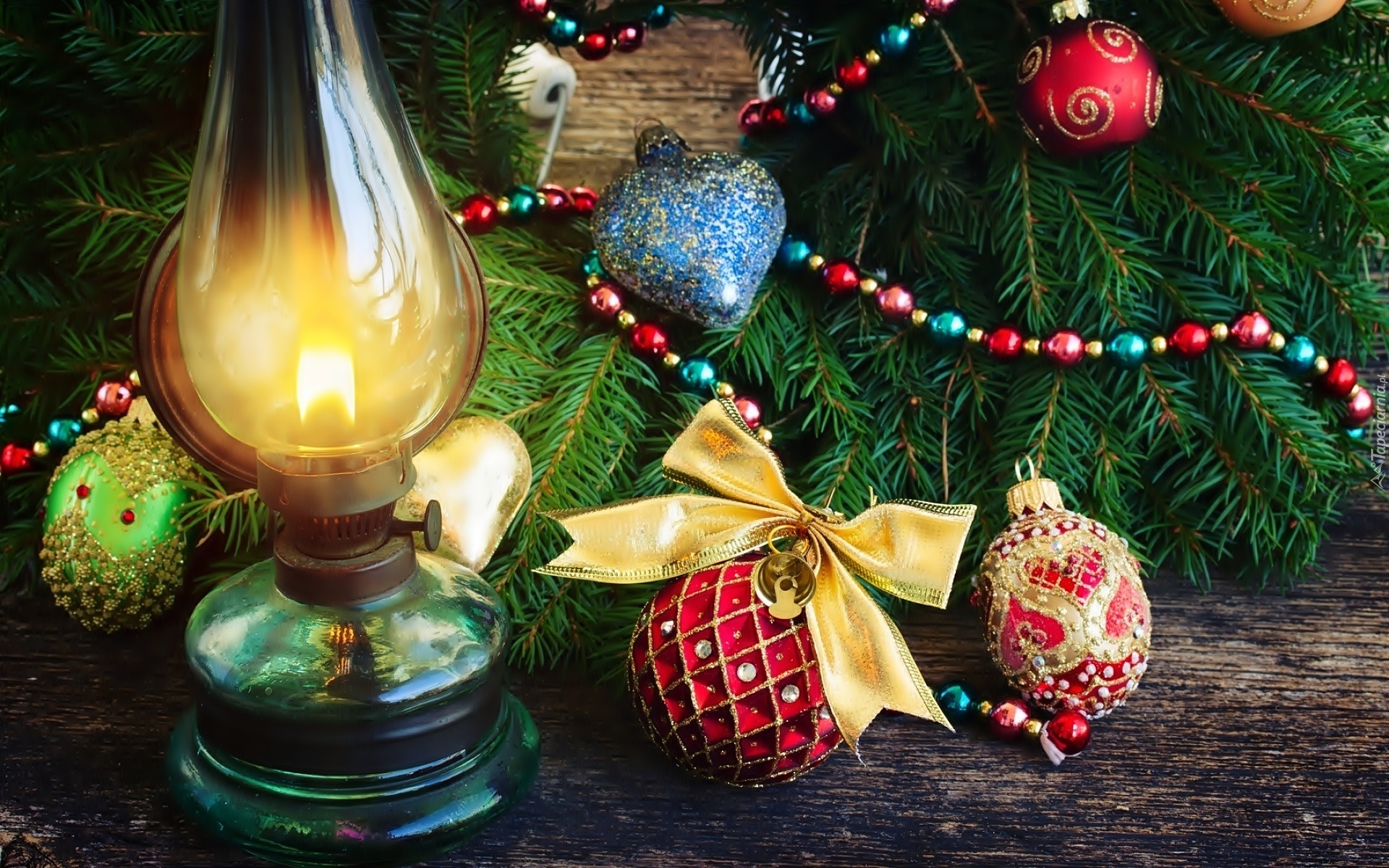 Edytor tapety: Boże Narodzenie, Gałązki Świerku, Lampa Naftowa, Bombki, Koraliki