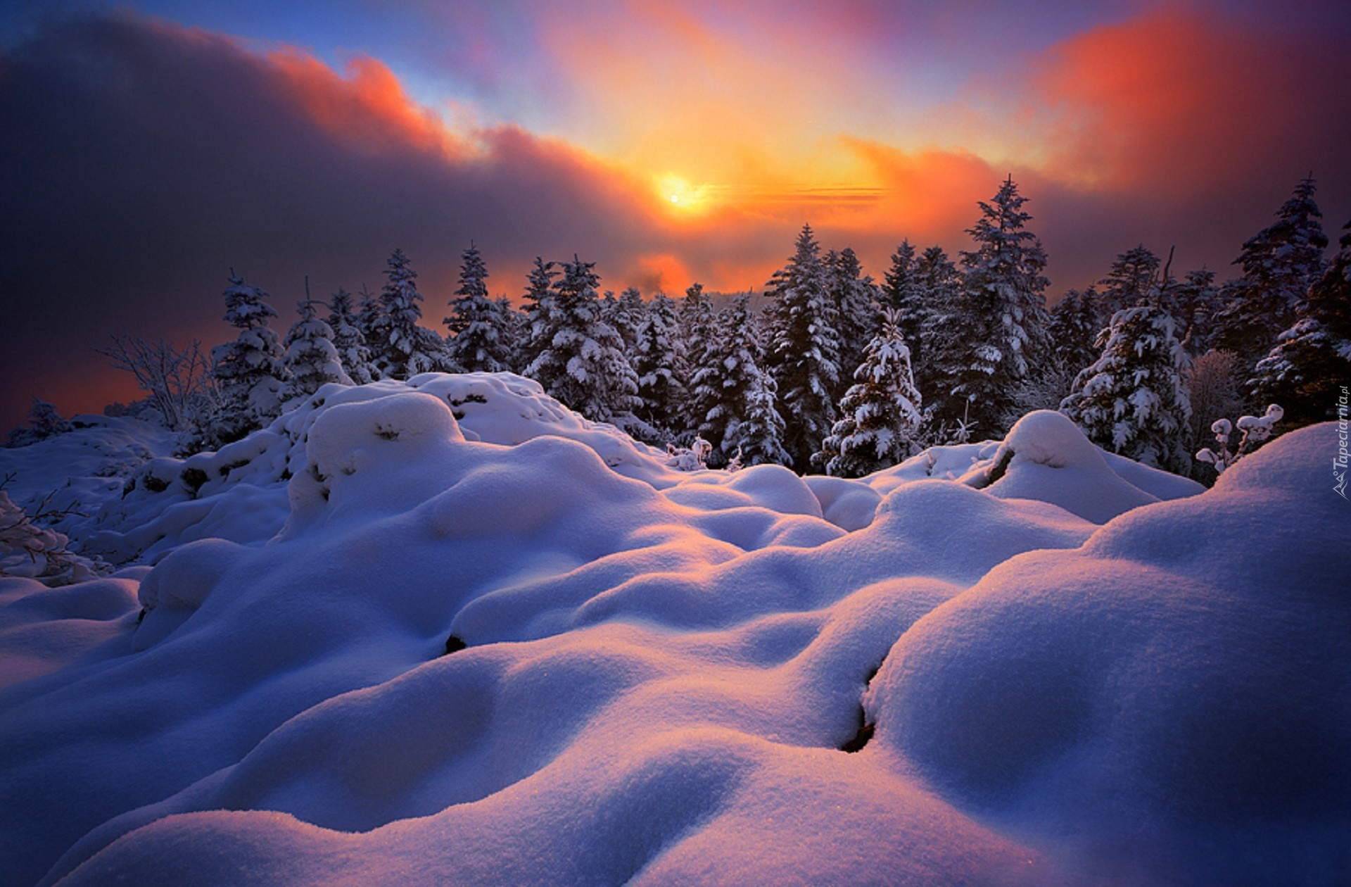 Edytor tapety: Zachód słońca, Las, Śnieg, Zima