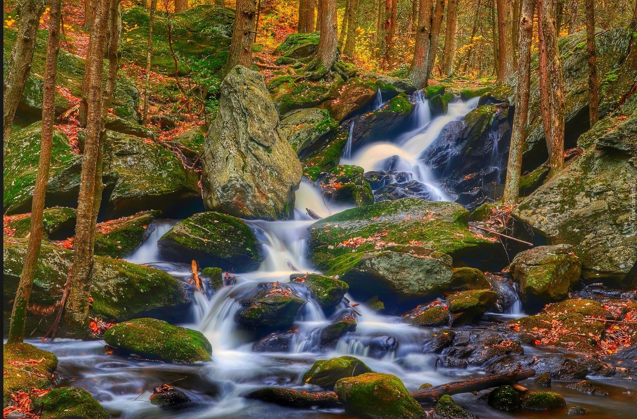 Edytor tapety: Wodospad, Las, Kamienie, Jesień