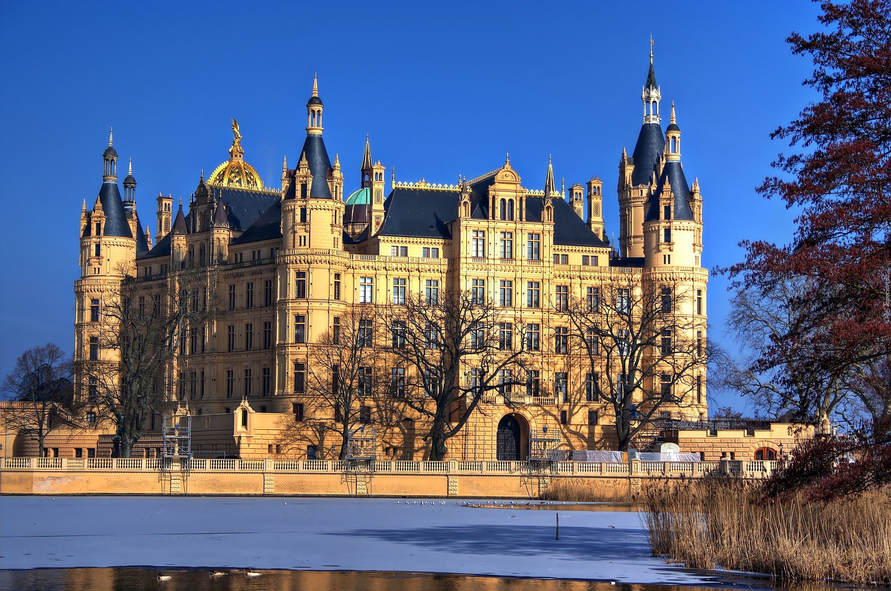 Edytor tapety: Zamek, Schwerin, Jezioro, Zima, Świt, Niemcy
