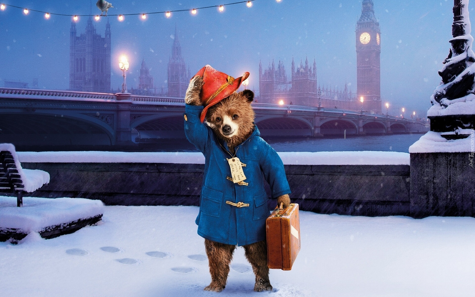 Edytor tapety: Miś, Paddington, Śnieg, Zima, Kapelusz, Walizka