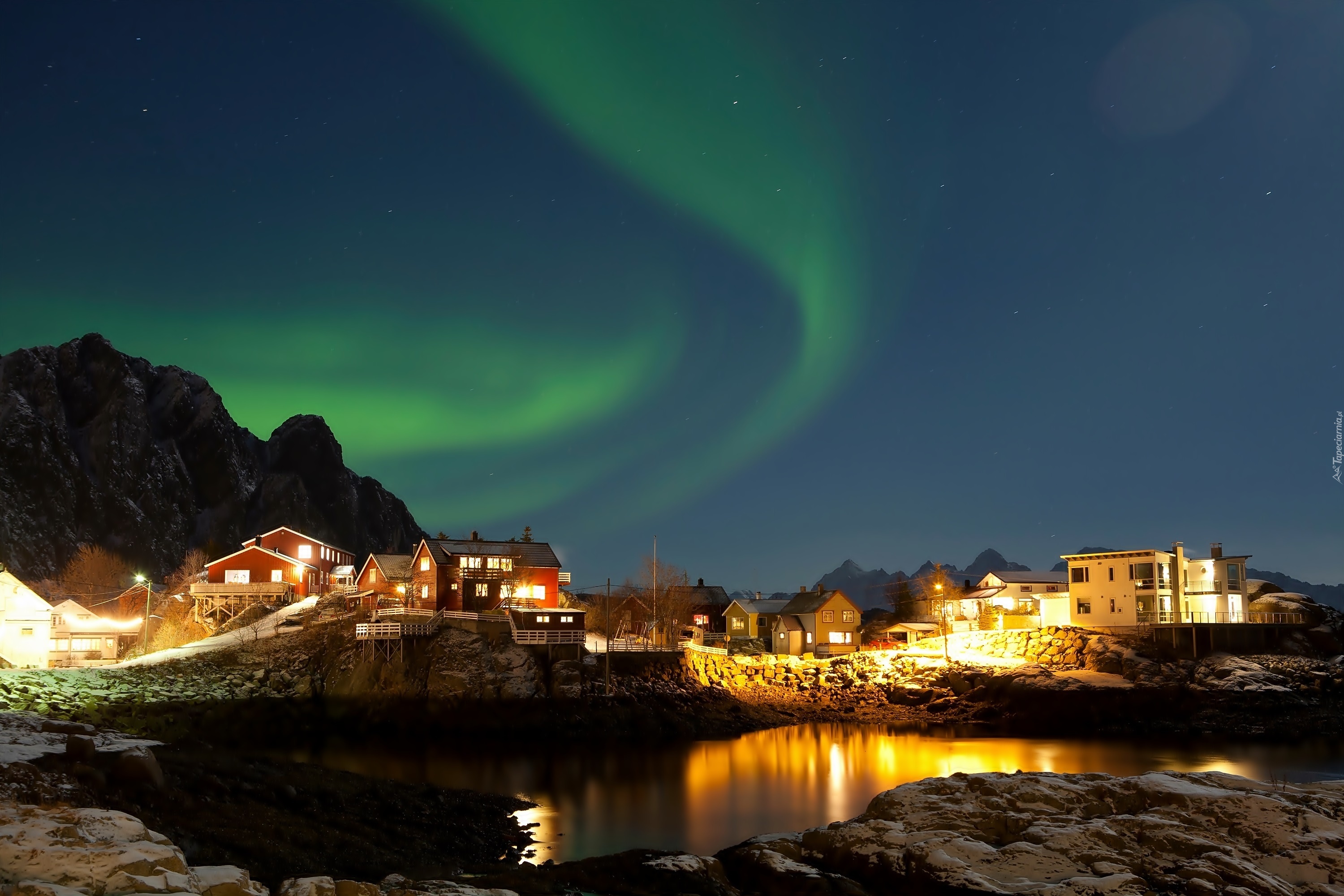 Edytor tapety: Domy, Osada, Jezioro, Góry, Zorza Polarna