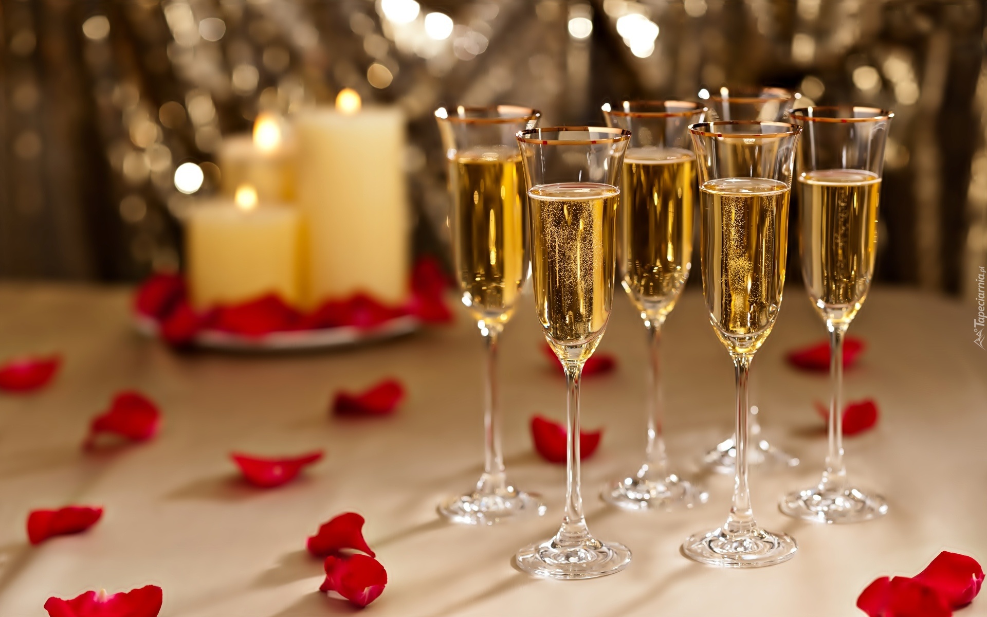 Edytor tapety: Okolicznościowe, Szampan, Kieliszki, Płatki, Róż, Świeczki