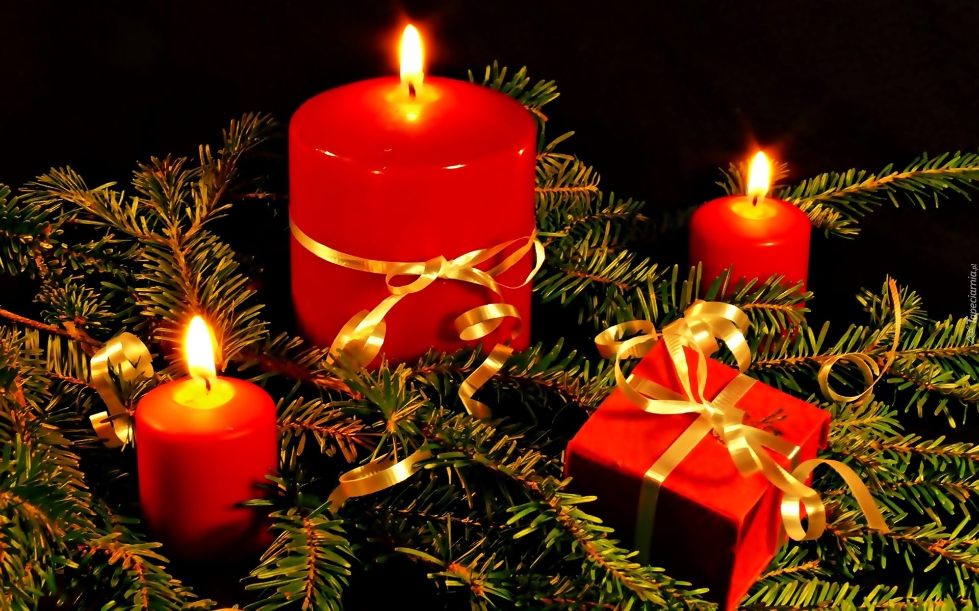Edytor tapety: Kompozycja, Świąteczna, Czerwone, Świeczki, Prezent, Gałązki, Świerkowe