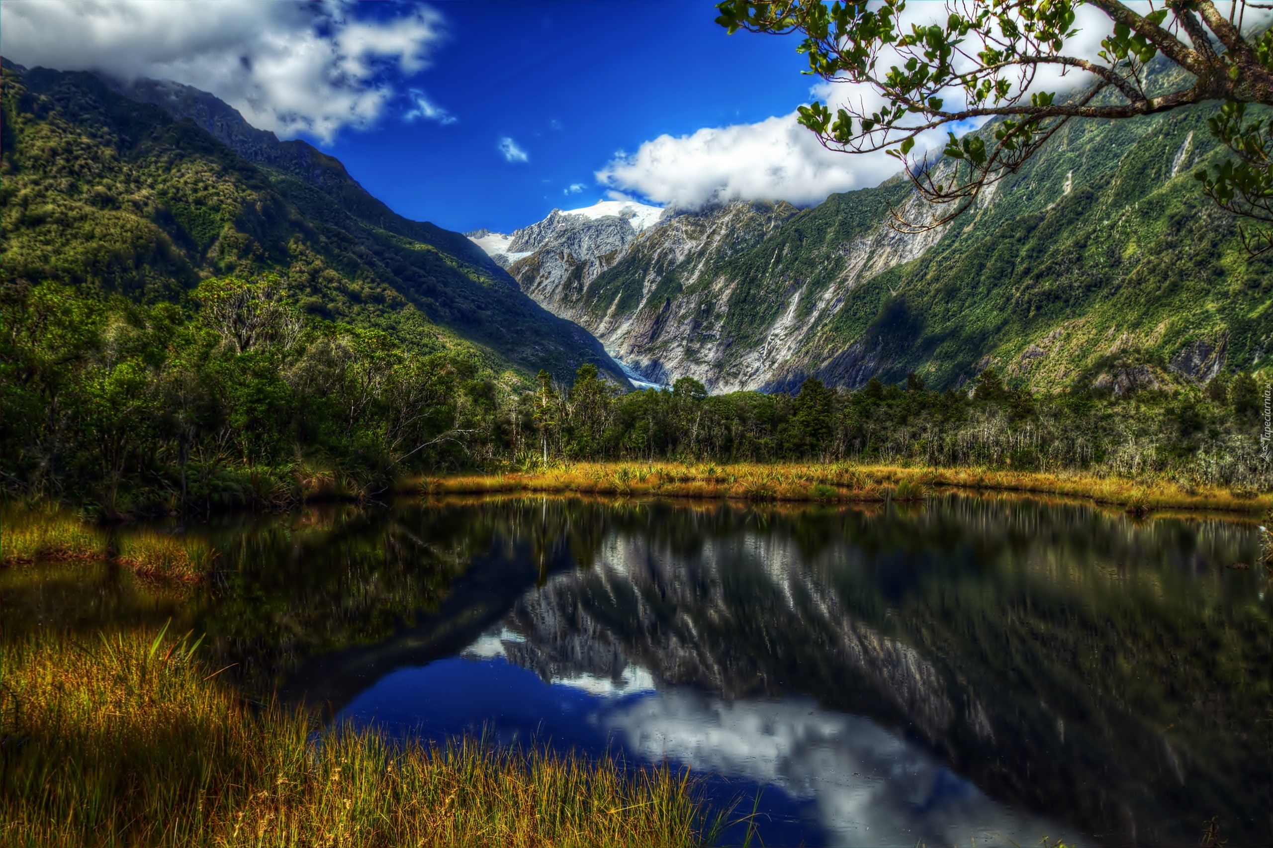 Edytor tapety: Nowa Zelandia, Park Narodowy Westland Tai Poutini, Lodowiec Franz Josef Glacier, Jezioro, Góry