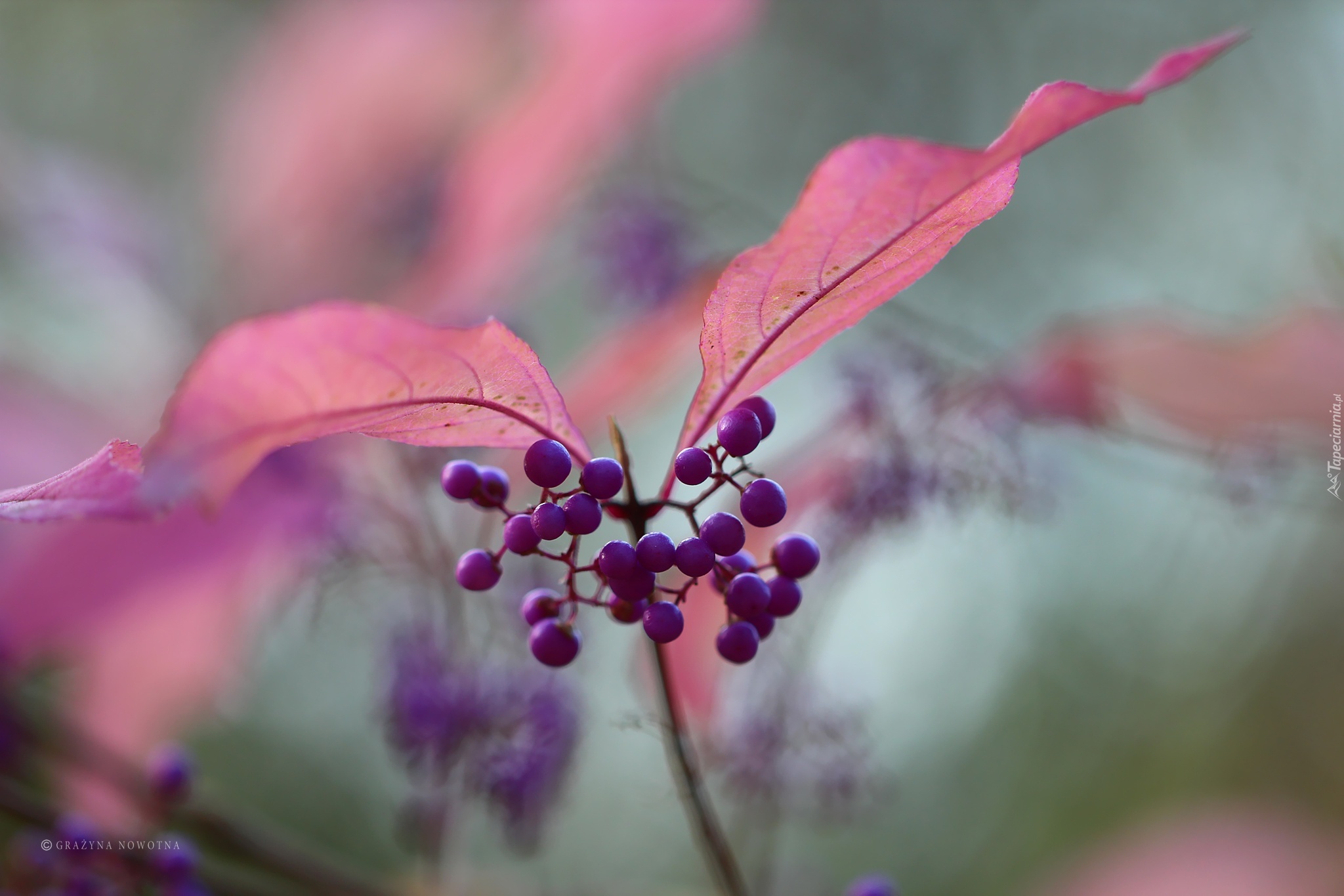 Edytor tapety: Pięknotka, Krzew, Fioletowe, Kulki, Różowe, Liście