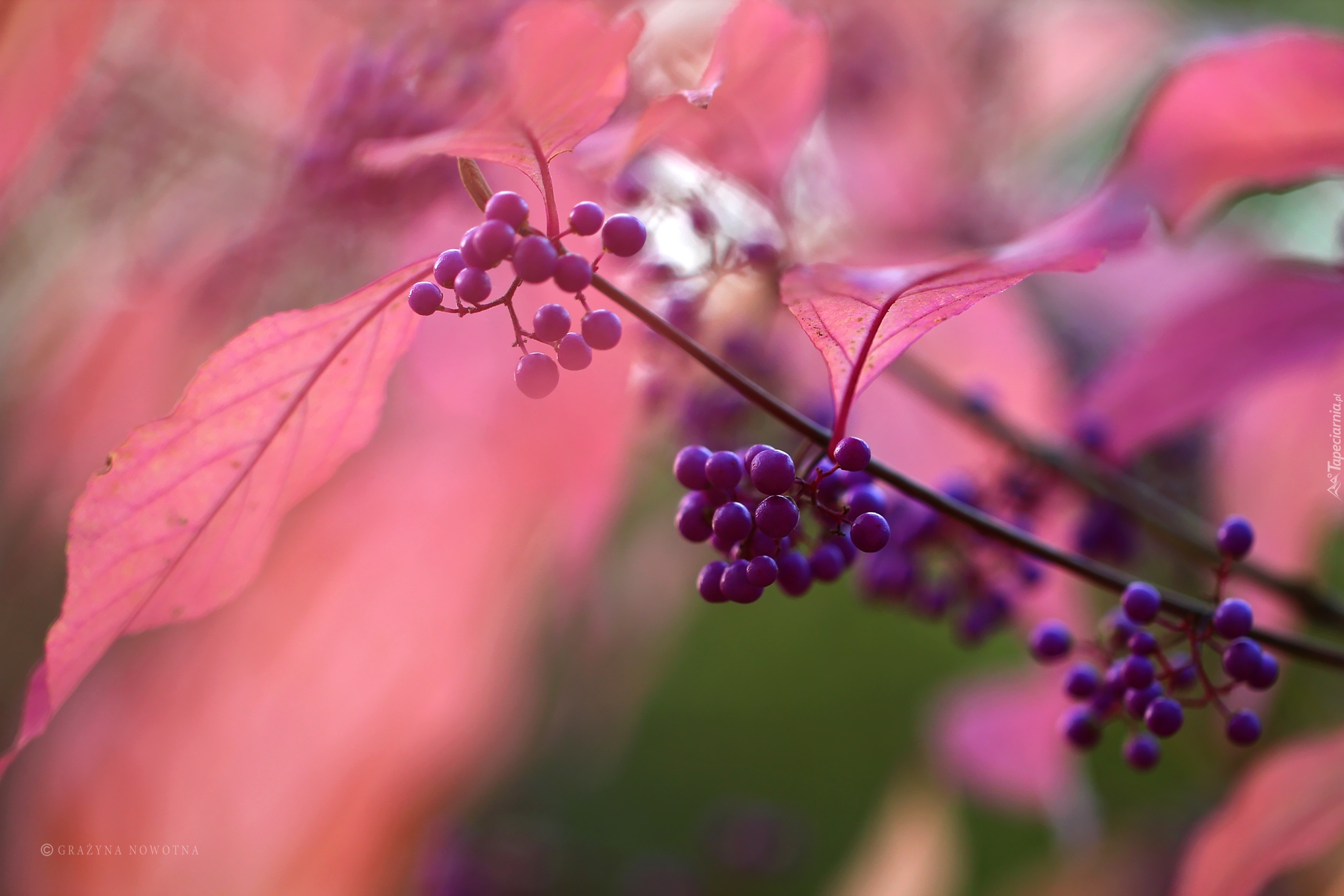 Edytor tapety: Pięknotka, Krzew, Fioletowe, Kulki, Różowe, Liście