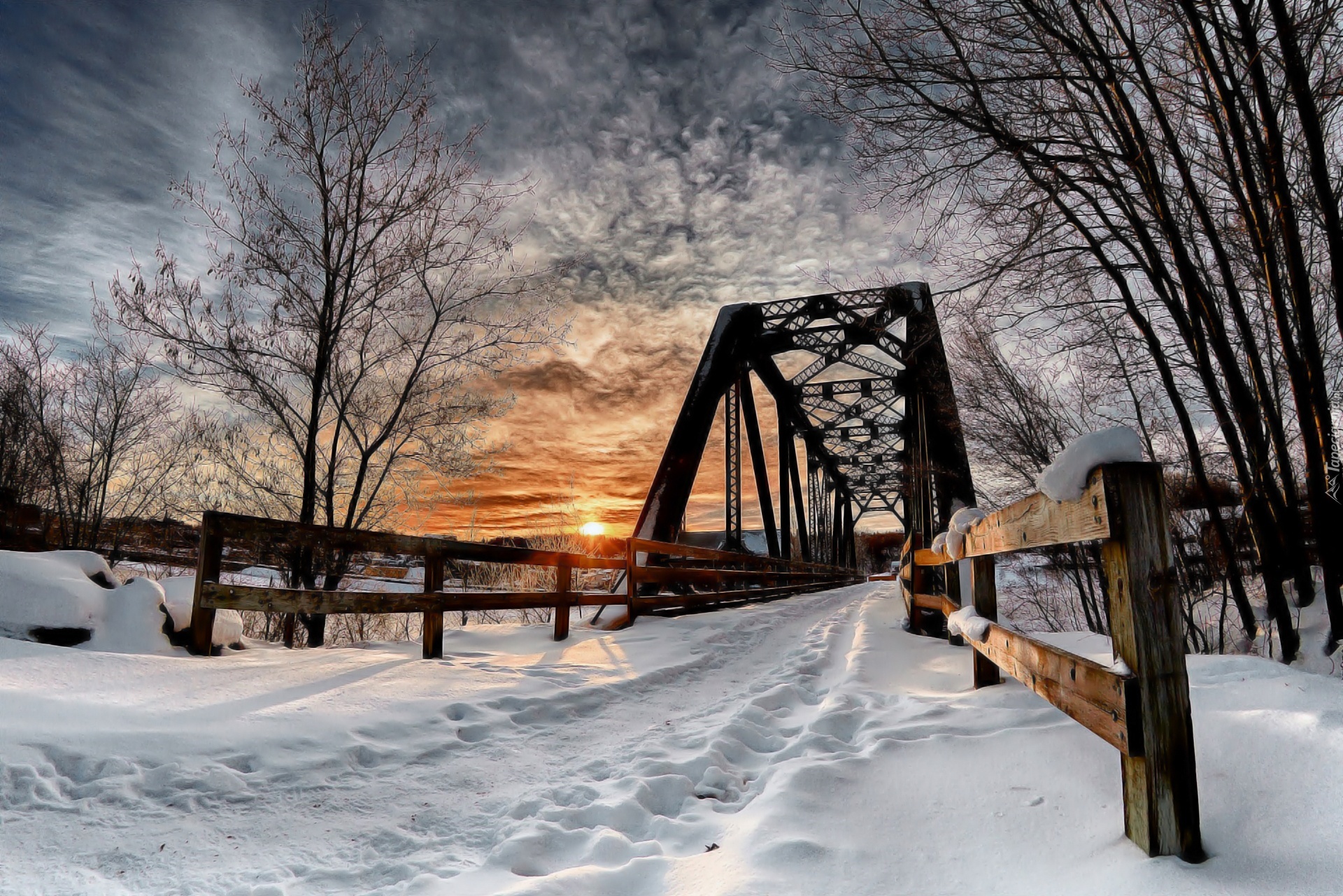 Edytor tapety: Zima, Most, Zachód, Słońca, Drzewa