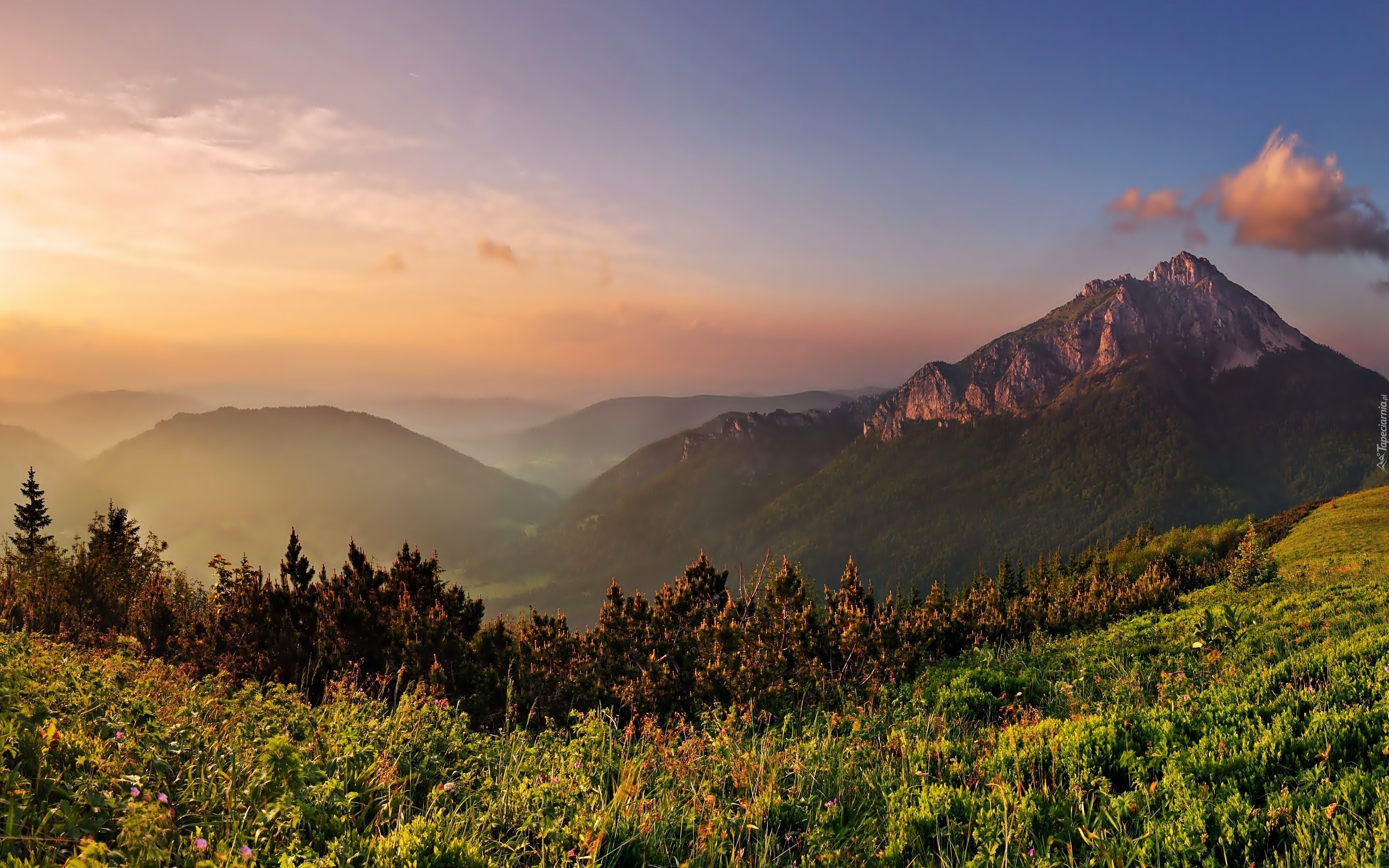 Edytor tapety: Góry, Mgła, Łąka, Świt