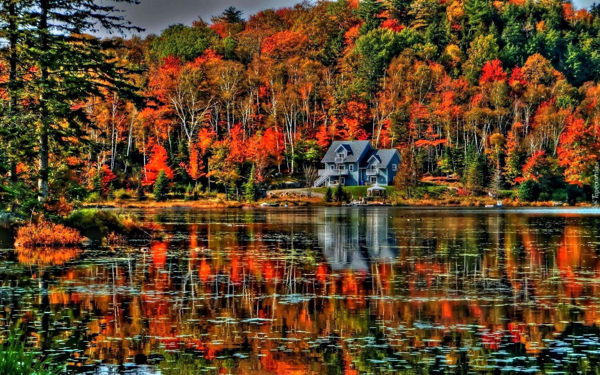Edytor tapety: Jesień, Drzewa, Jezioro, Dom, Odbicie