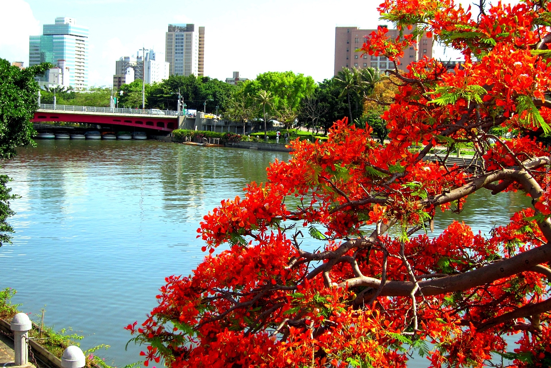 Edytor tapety: Drzewo, Rzeka, Most, Wieżowce