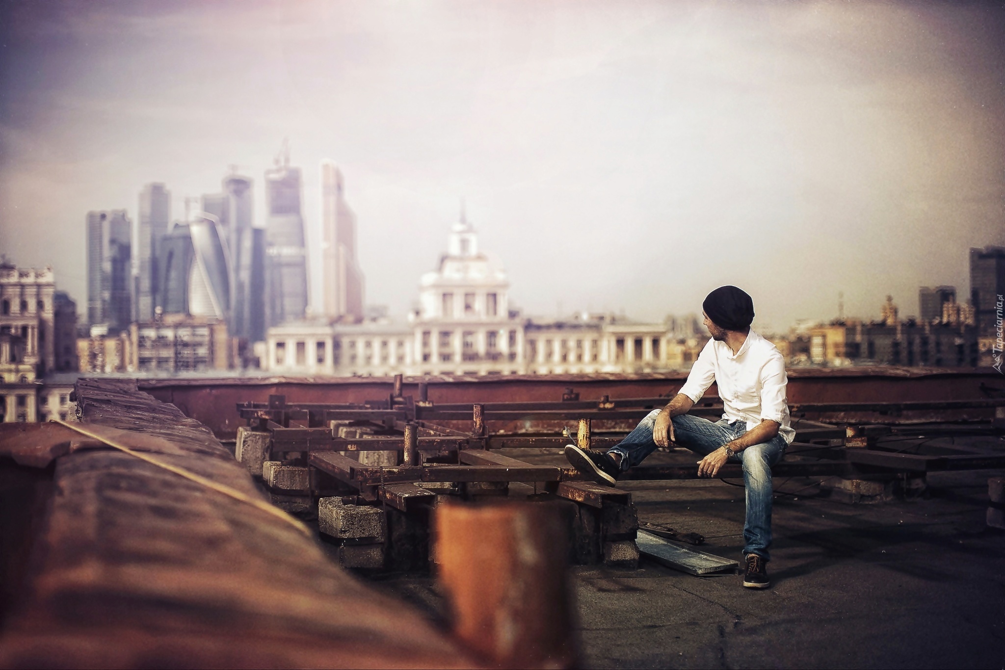 Edytor tapety: Dom, Drapacze Chmur, Dach, Mężczyzna