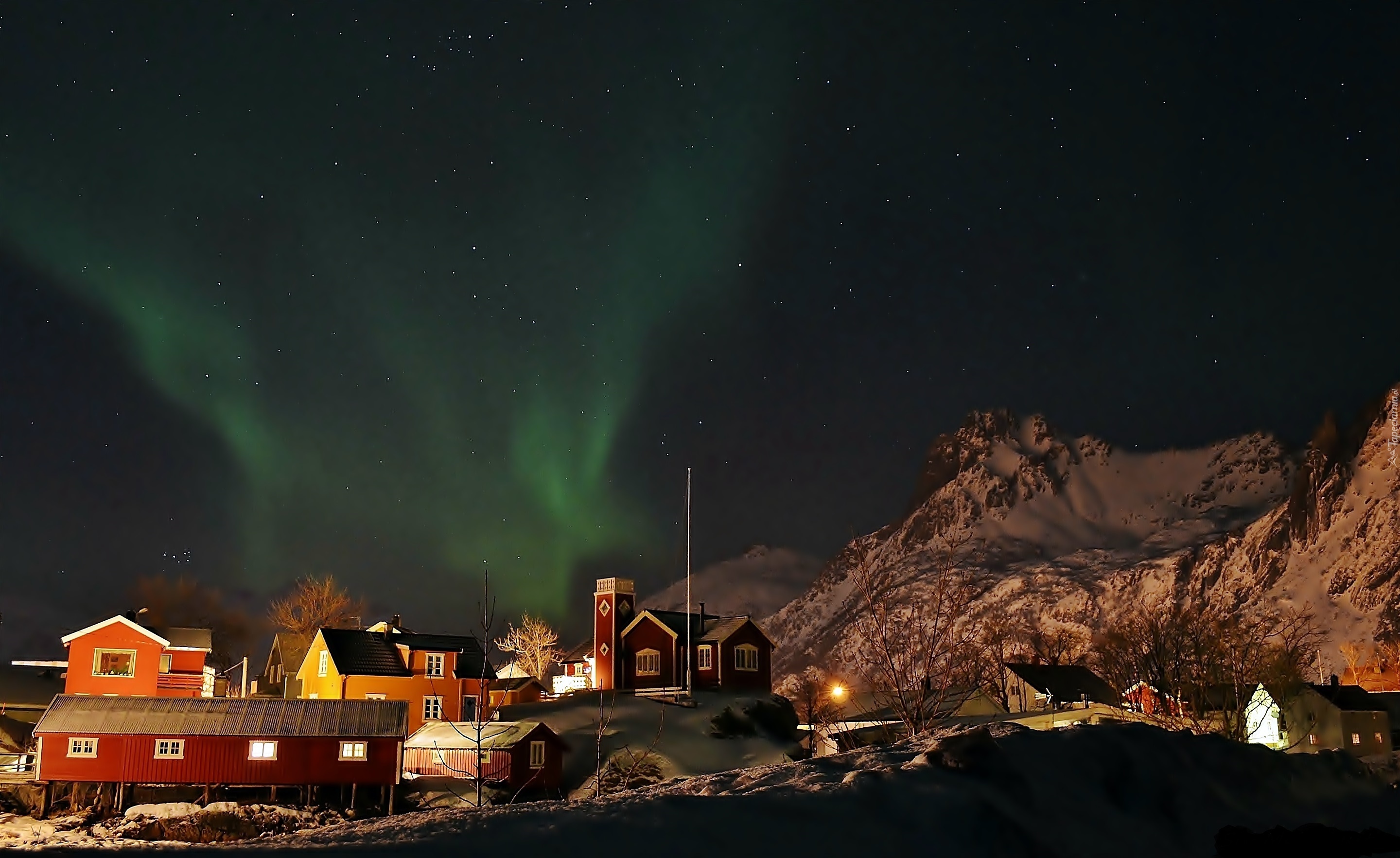 Edytor tapety: Domy, Osada, Góry, Zorza, Polarna, Lofoty