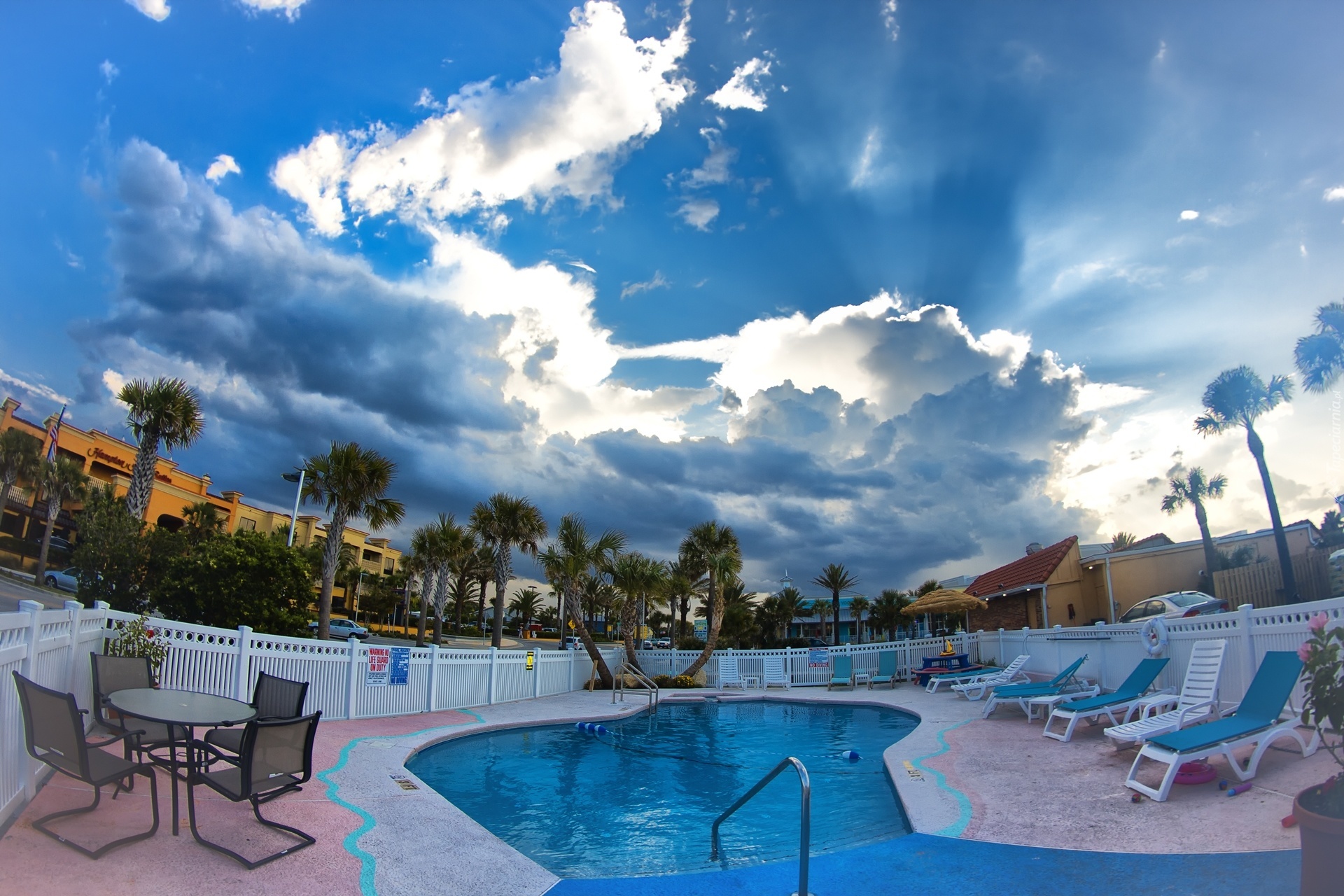 Edytor tapety: Basen, Palmy, Niebo, Chmury