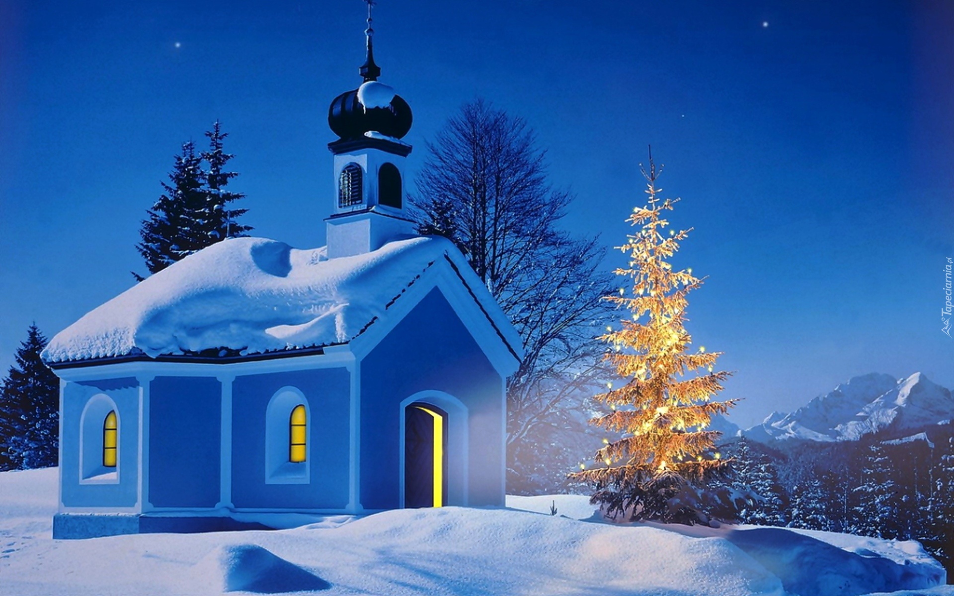 Edytor tapety: Zima, Śnieg, Cerkiew, Oświetlona, Choinka