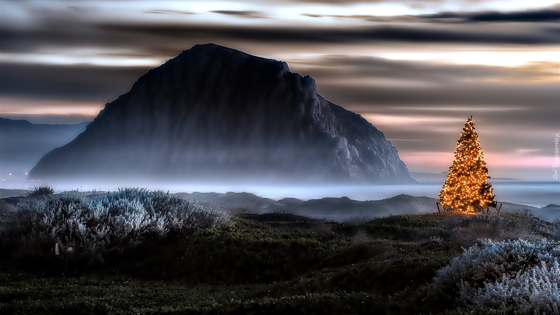 Edytor tapety: Góra, Świecąca, Choinka, Chmury