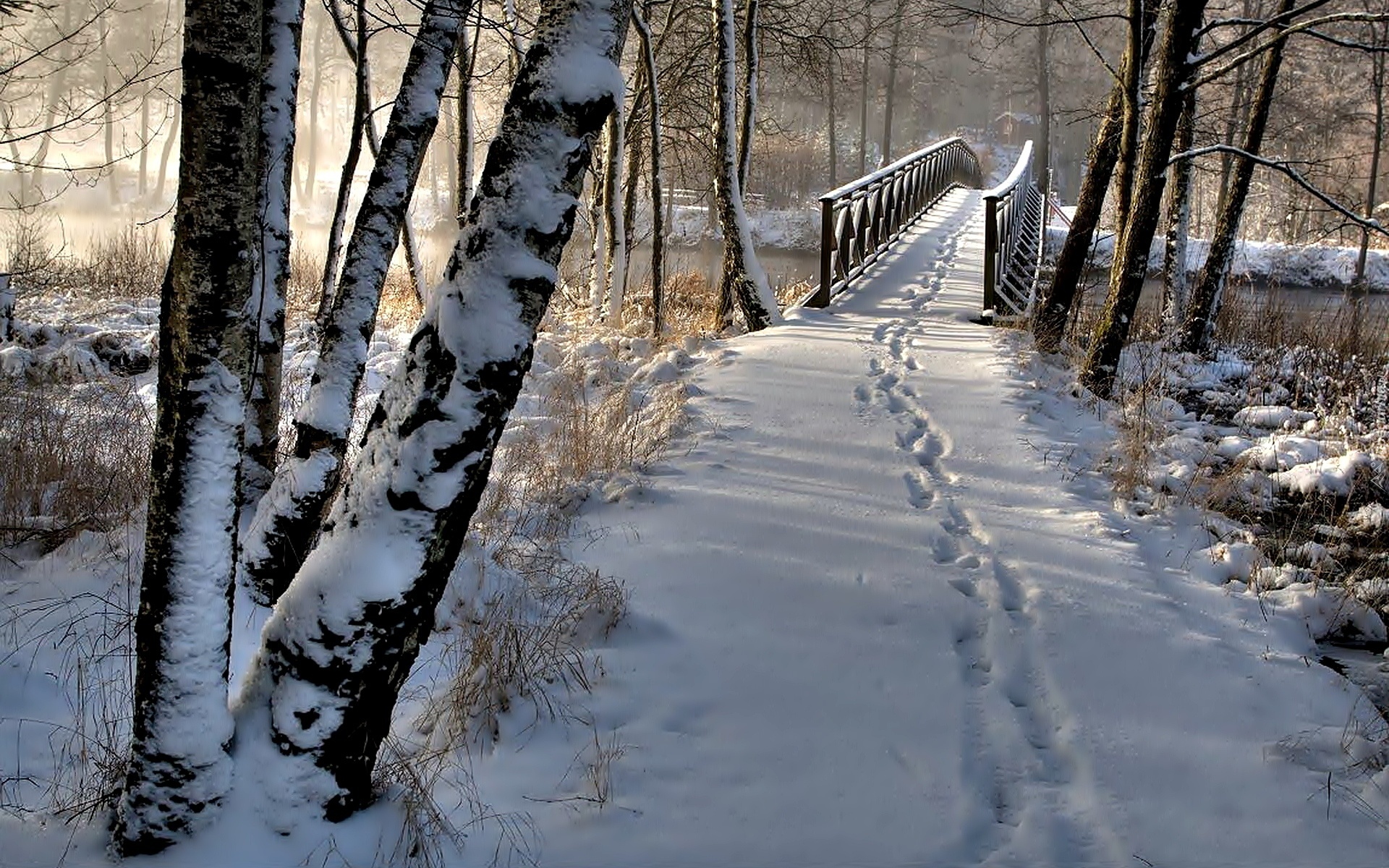 Edytor tapety: Zima, Śnieg, Park, Drzewa, Drewniany, Most, Ślady