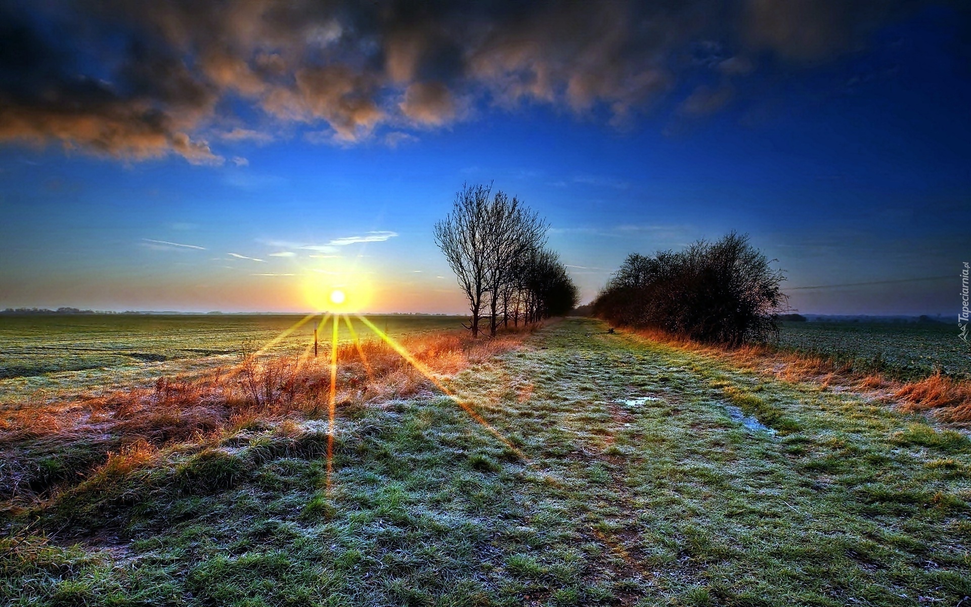 Edytor tapety: Pola, Łąki, Promienie, Słońca, Szron, Drzewa