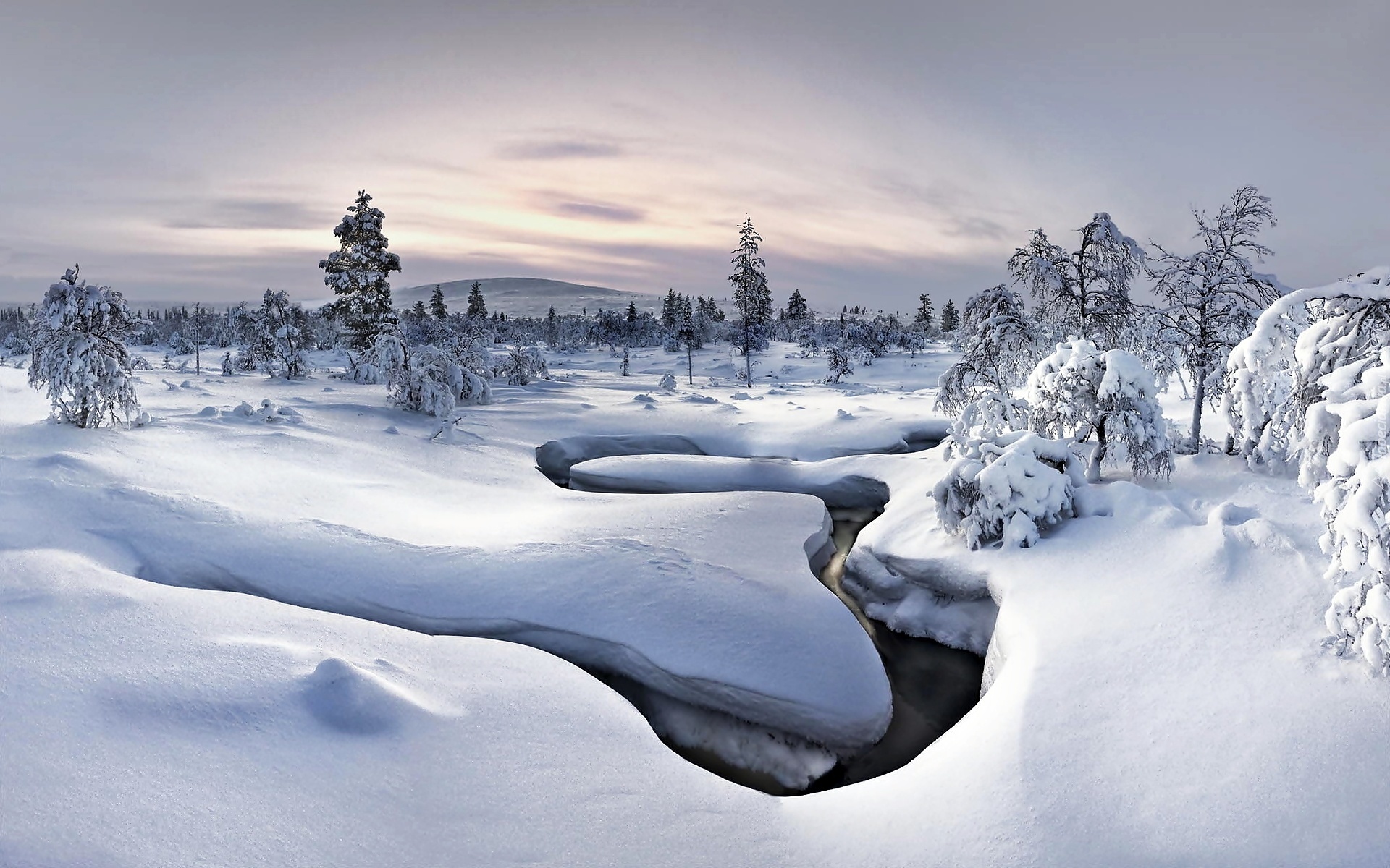 Edytor tapety: Zima, Śnieg, Góry, Las, Rzeka, Drzewa