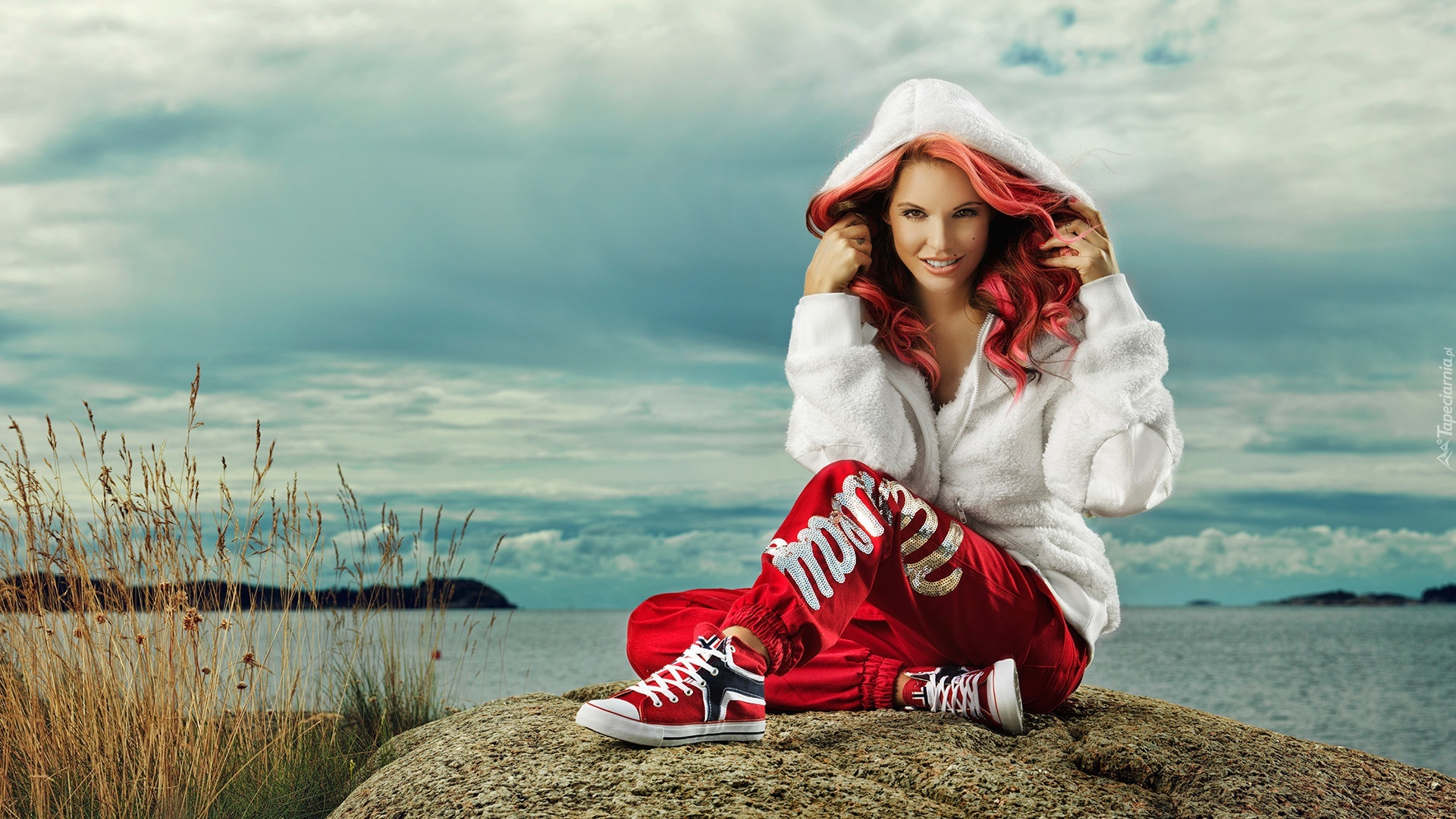 Edytor tapety: Rudowłosa, Dres, Moda, Kamień, Jezioro