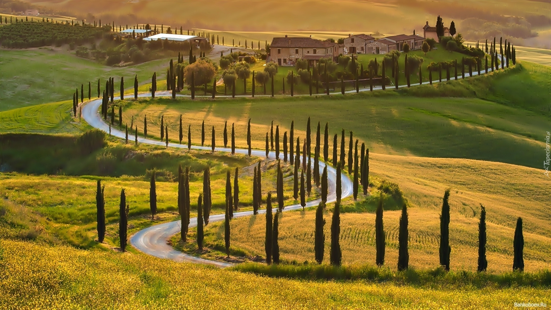 Edytor tapety: Pola, Łąki, Kręta, Droga, Drzewa, Wieś, Toskania, Włochy