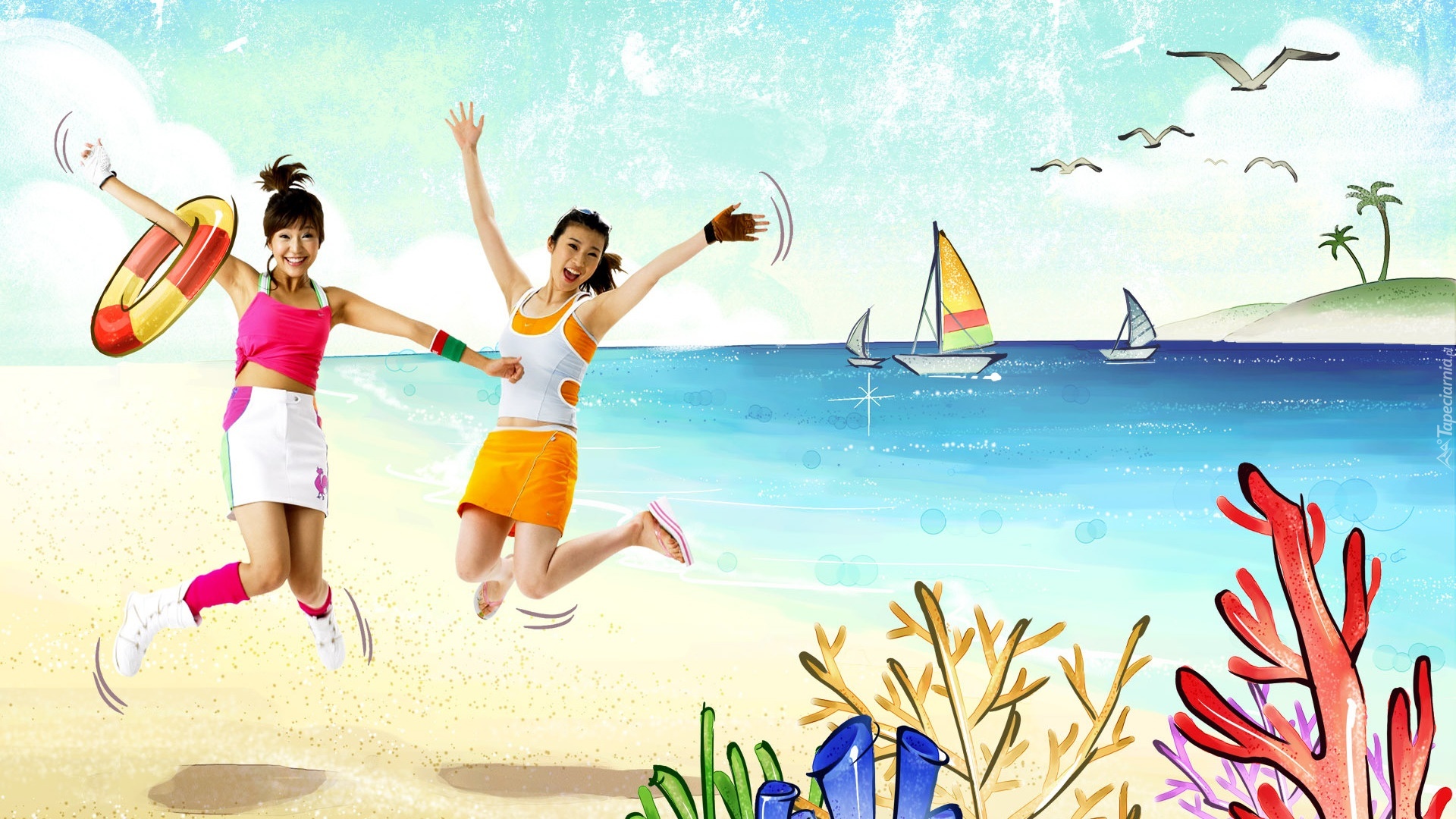 Edytor tapety: Plaża, Morze, Łodzie, Dziewczyny, 2D