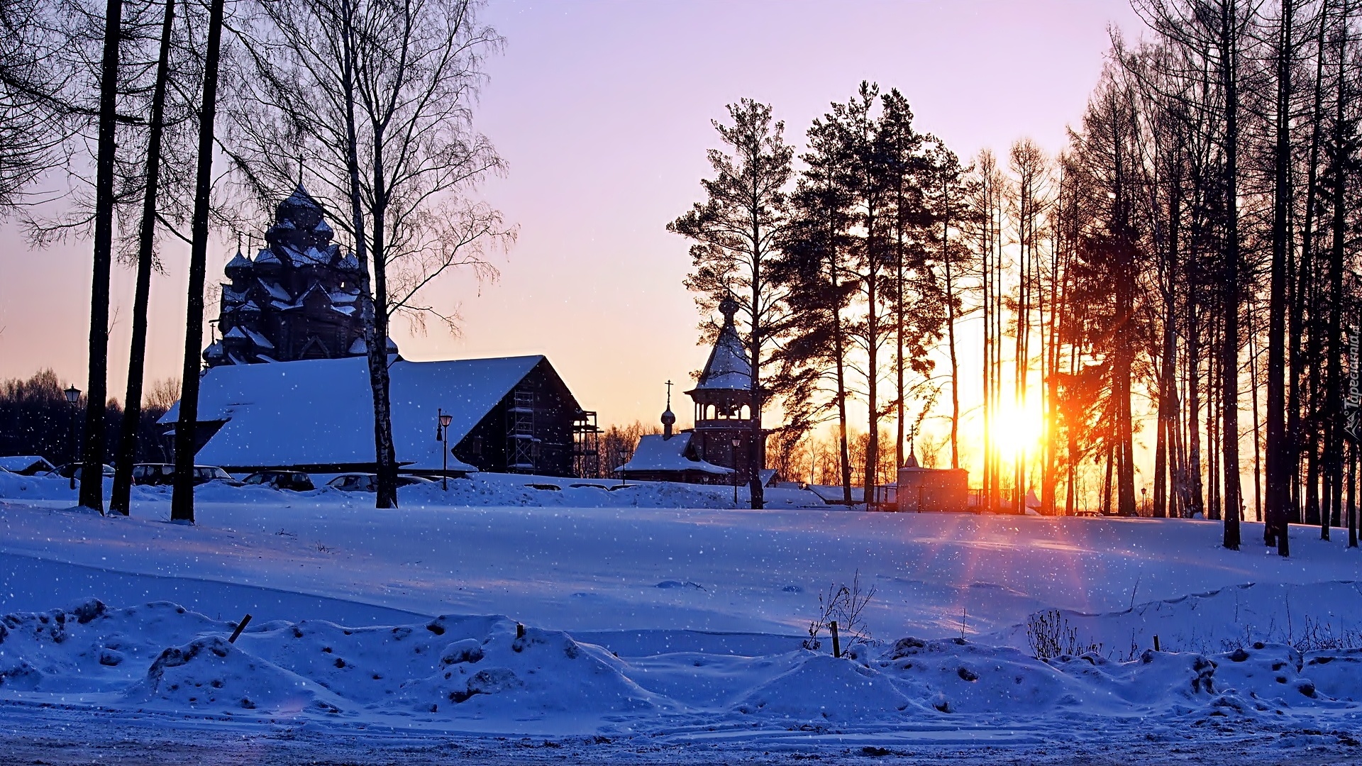 Edytor tapety: Cerkiew, Zima, Zachód, Słońca, Drzewa