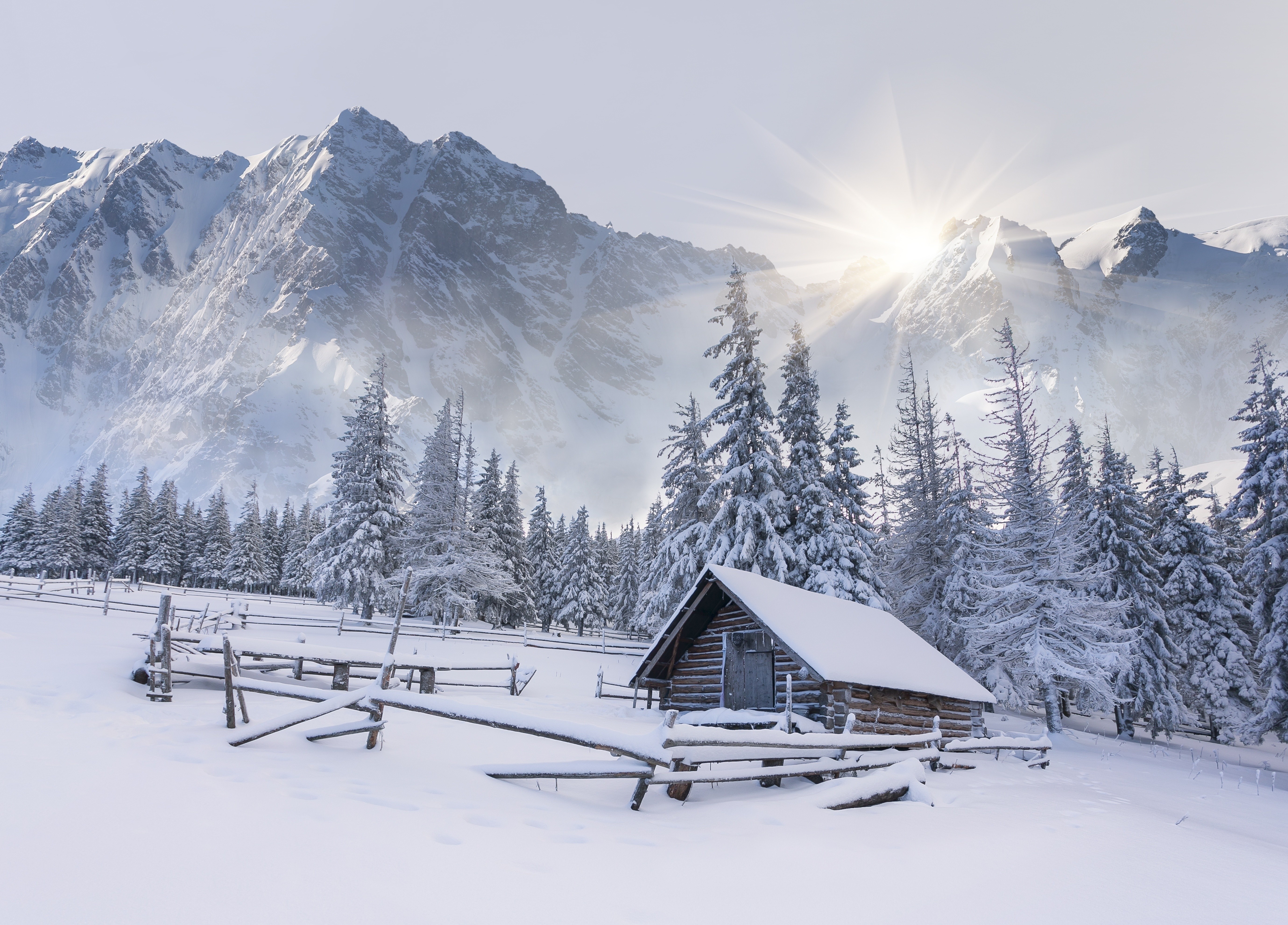 Edytor tapety: Zima, Śnieg, Góry, Wschód Słońca, Ogrodzenie, Dom