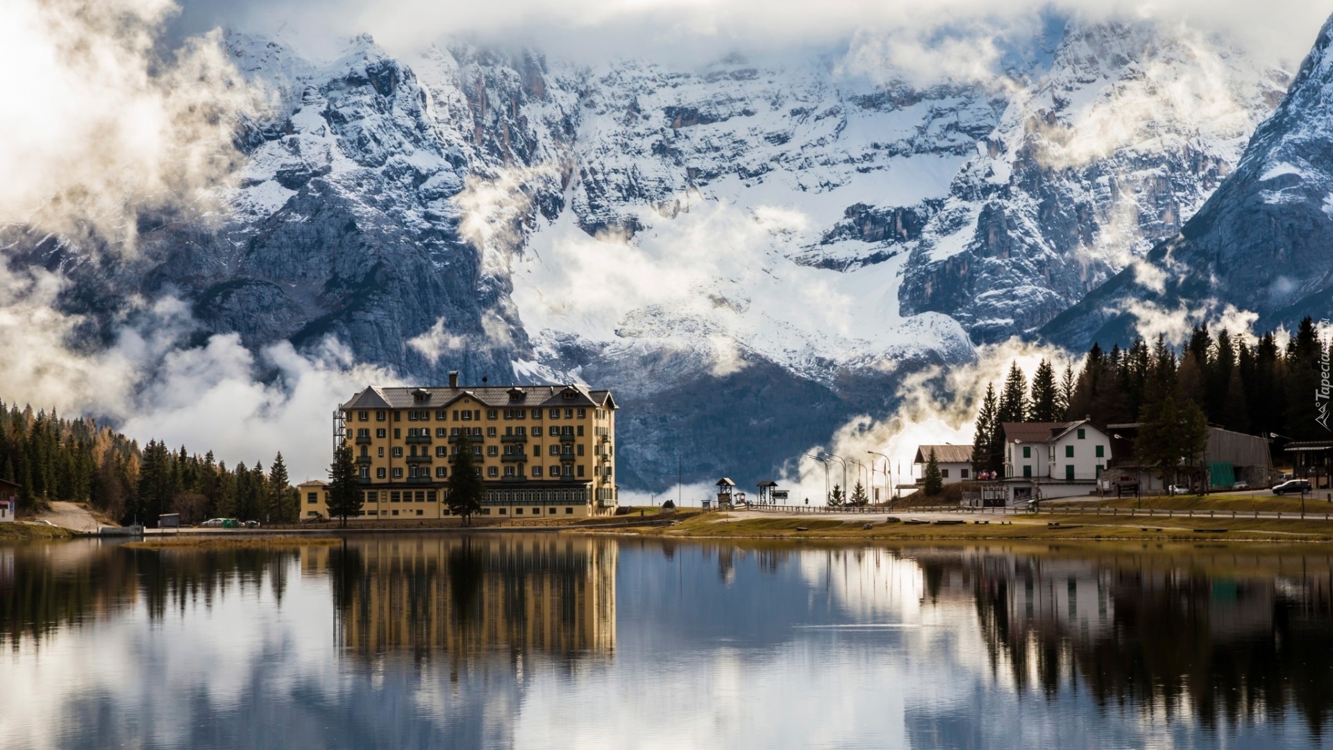Edytor tapety: Zima, Jezioro, Góry, Hotel