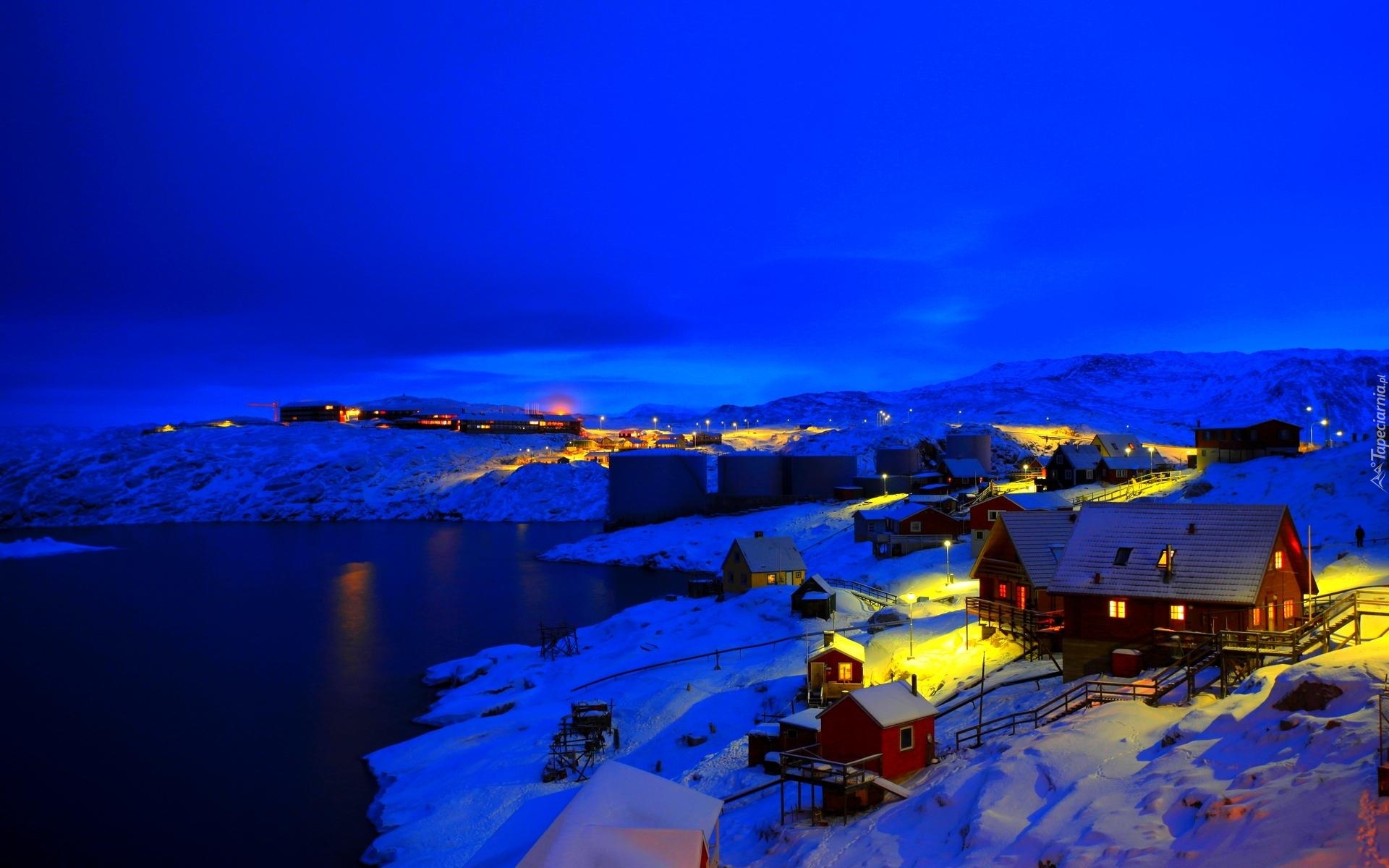 Edytor tapety: Domy, Zima, Światła, Woda, Wieś