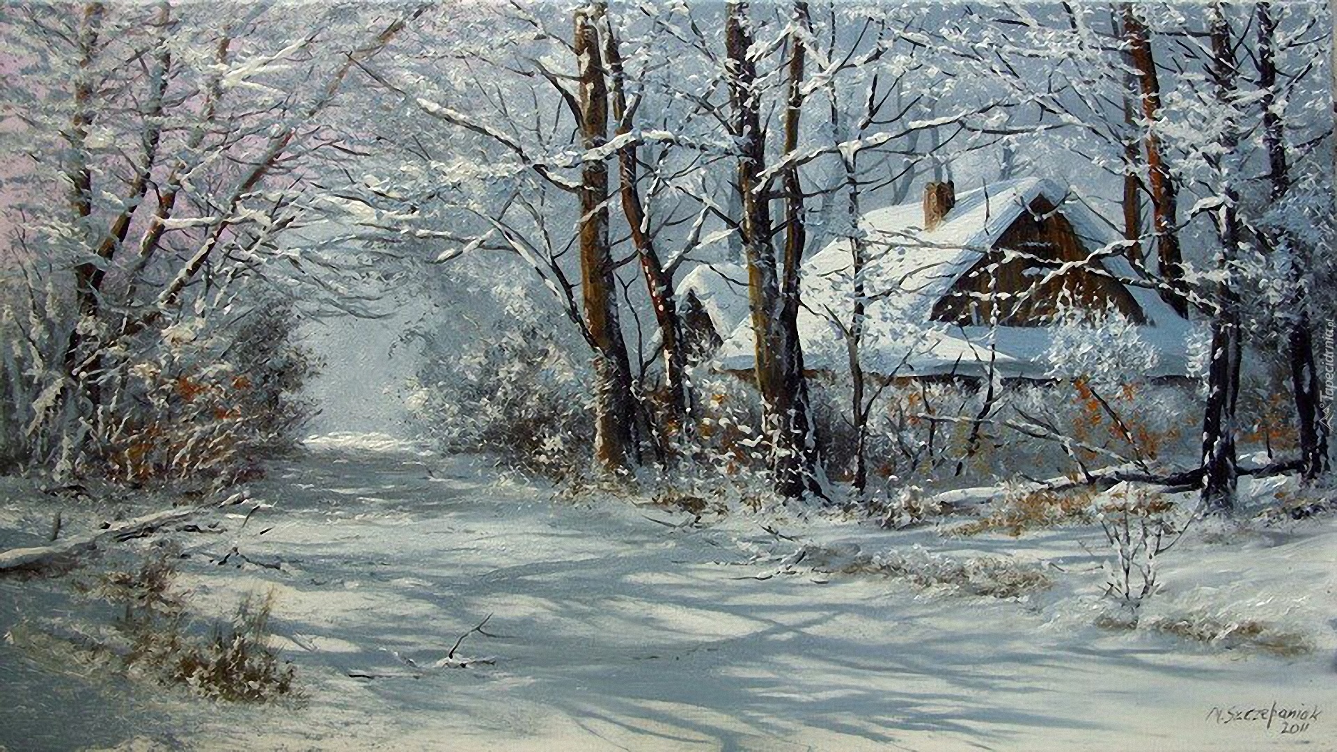 Edytor tapety: Marek Szczepaniak, Malarstwo, Zima, Chata, Droga, Las