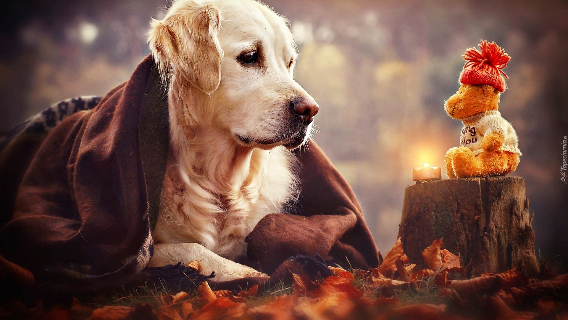 Edytor tapety: Pies, Golden retriever, Zabawka, Miś, Świeczka, Pień