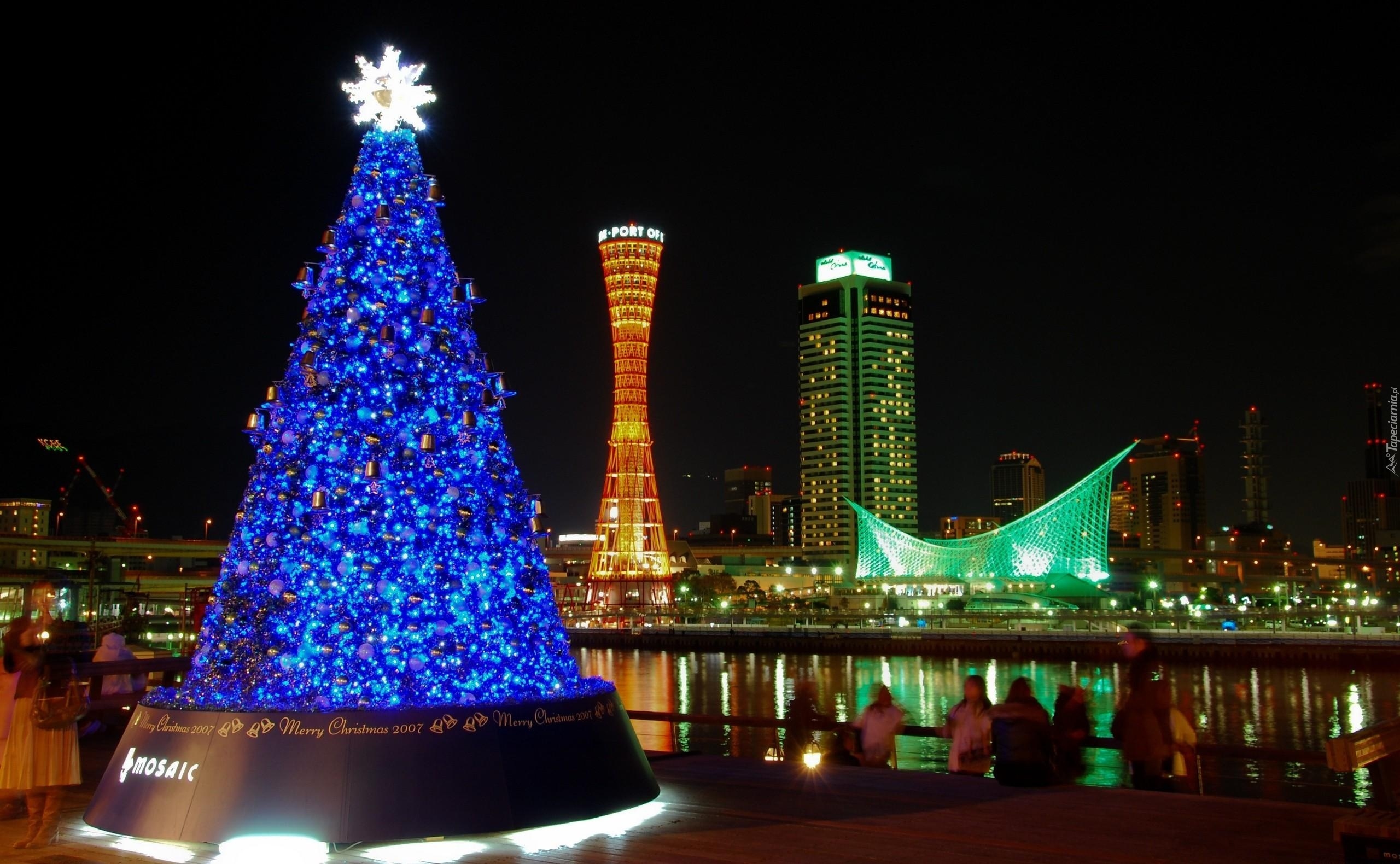 Edytor tapety: Choinka, Światełka, Miasto, Noc