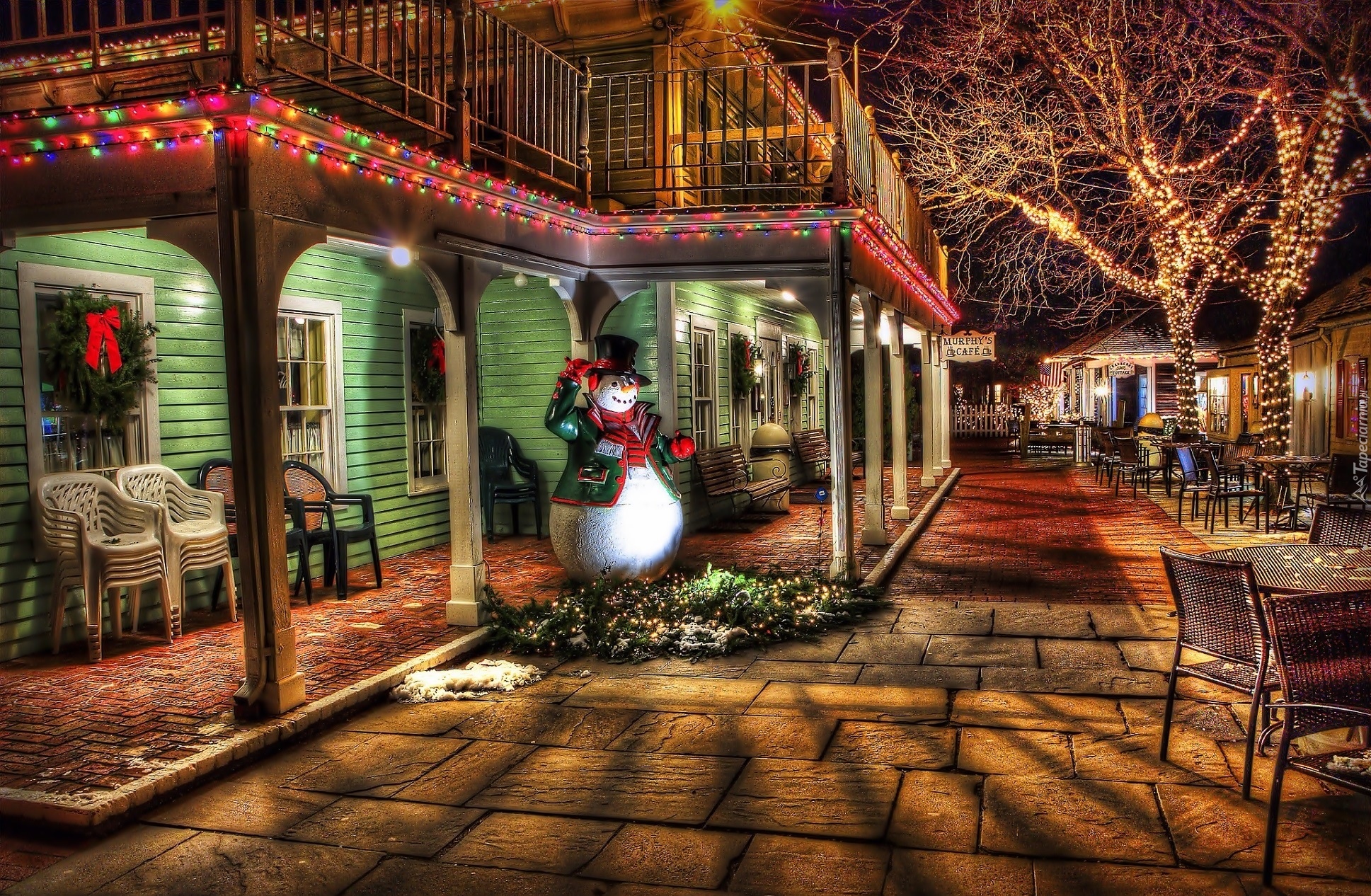 Edytor tapety: Miasto, Nocą, Bałwanek, Świąteczne, Dekoracje, Dom