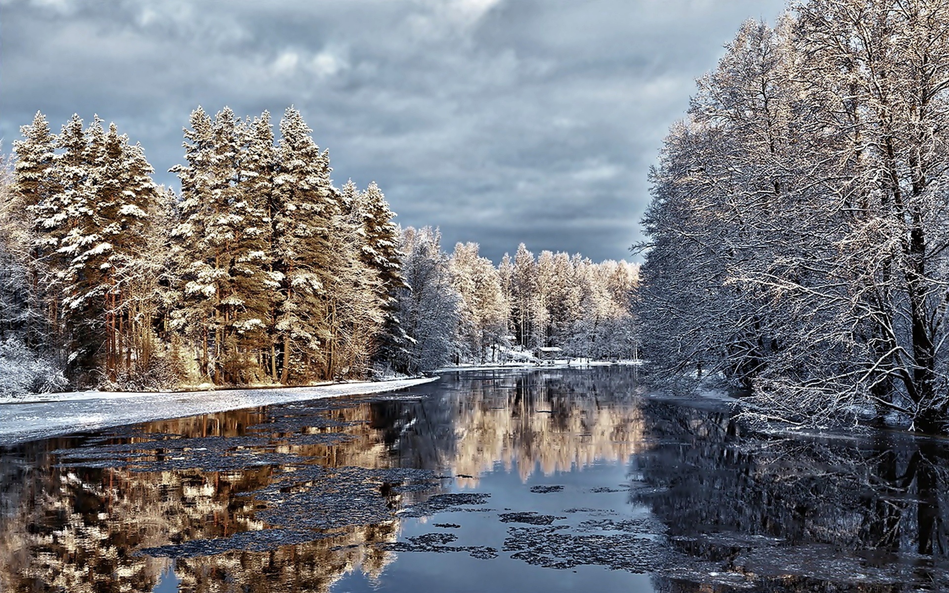 Edytor tapety: Zima, Śnieg, Rzeka, Las, Drzewa