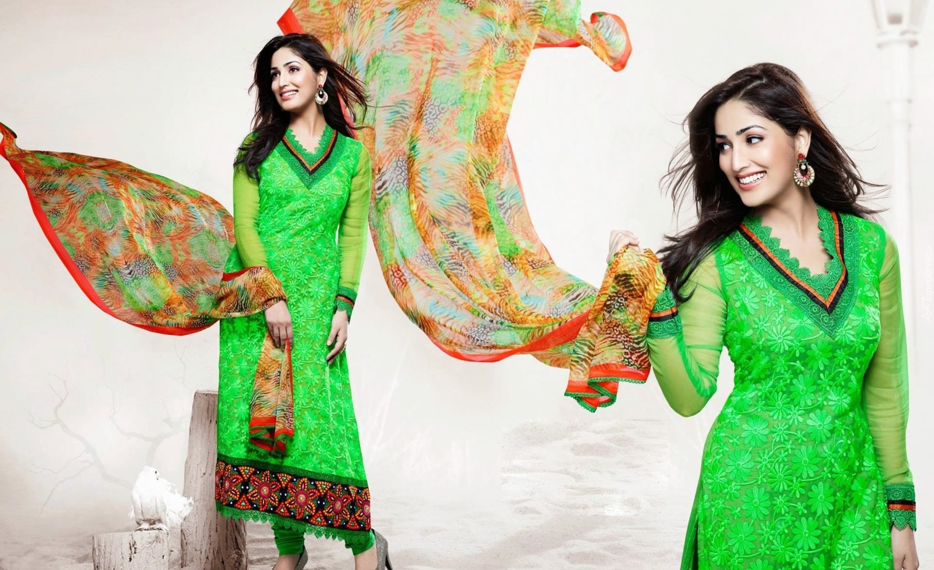 Edytor tapety: Kobieta, Sari, Zielona, Suknia