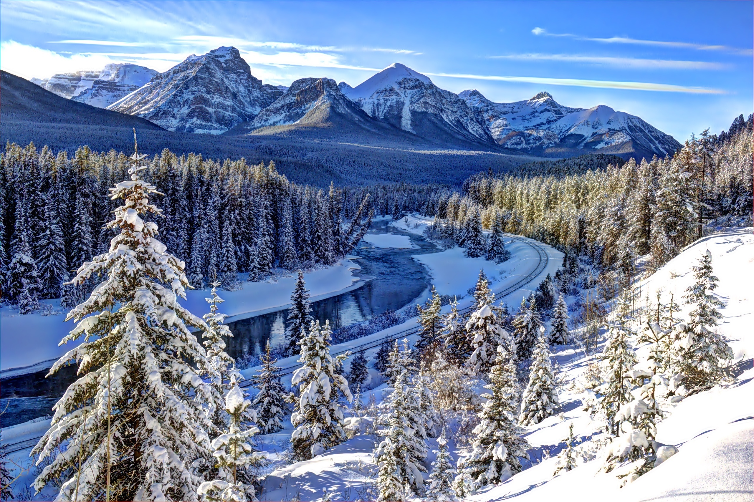 Edytor tapety: Zima, Rzeka, Góry, Ośnieżone, Świerki