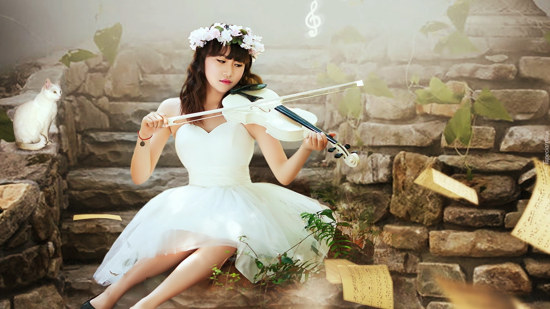 Edytor tapety: Kobieta, Sukienka, Skrzypce, Mur, Kot